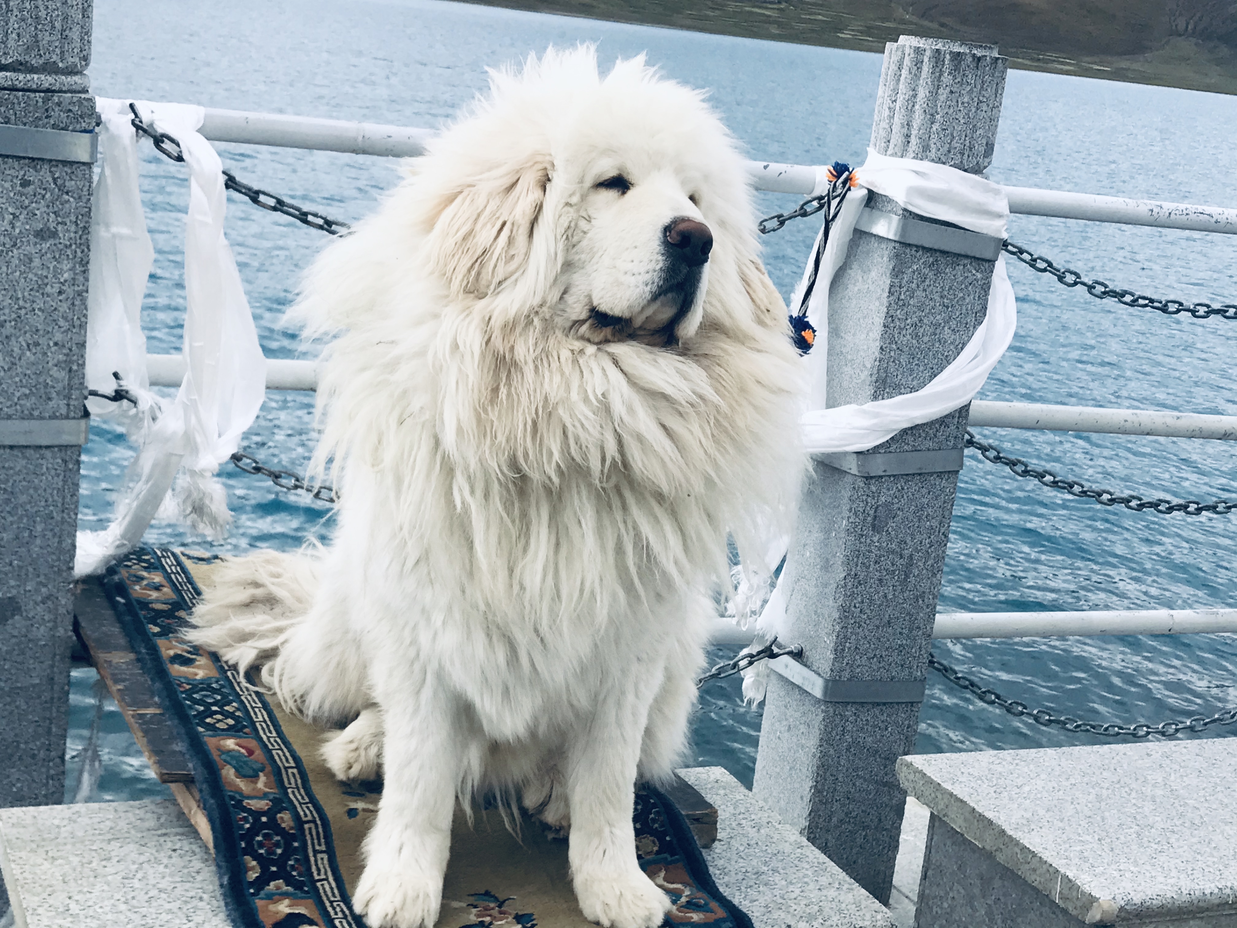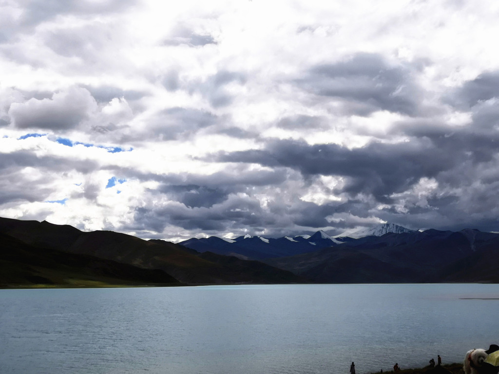 第二个观景台看起来一般,可能是和天气突然转阴有关系。天气阴嗖嗖,本该是蓝幽幽的羊湖仿佛披上了一层灰蒙蒙的滤镜。在这个观景台有许多牧民摆摊,主营业务是饰品销售和藏獒和牦牛的付费合影。