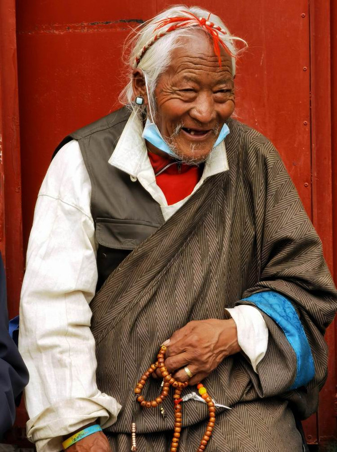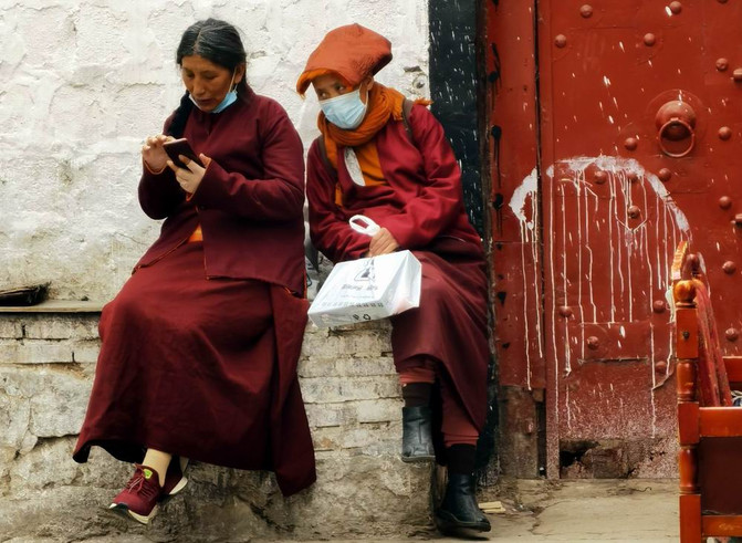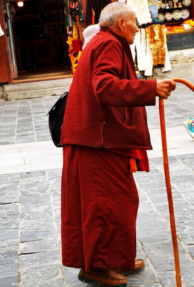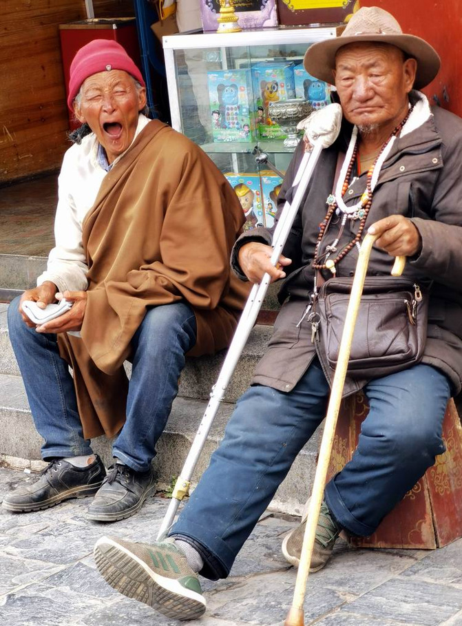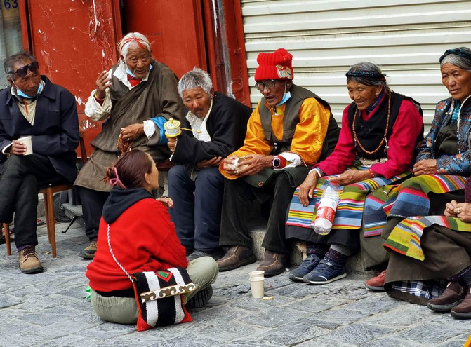 今天的八廓街,融合着传统与现代、东方与西方、宗教与繁荣的文化与经济,是了解西藏的一扇窗口,也是拉萨最有趣的老街。图为八廓街上休息的转经者。