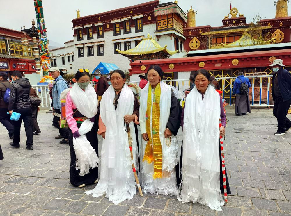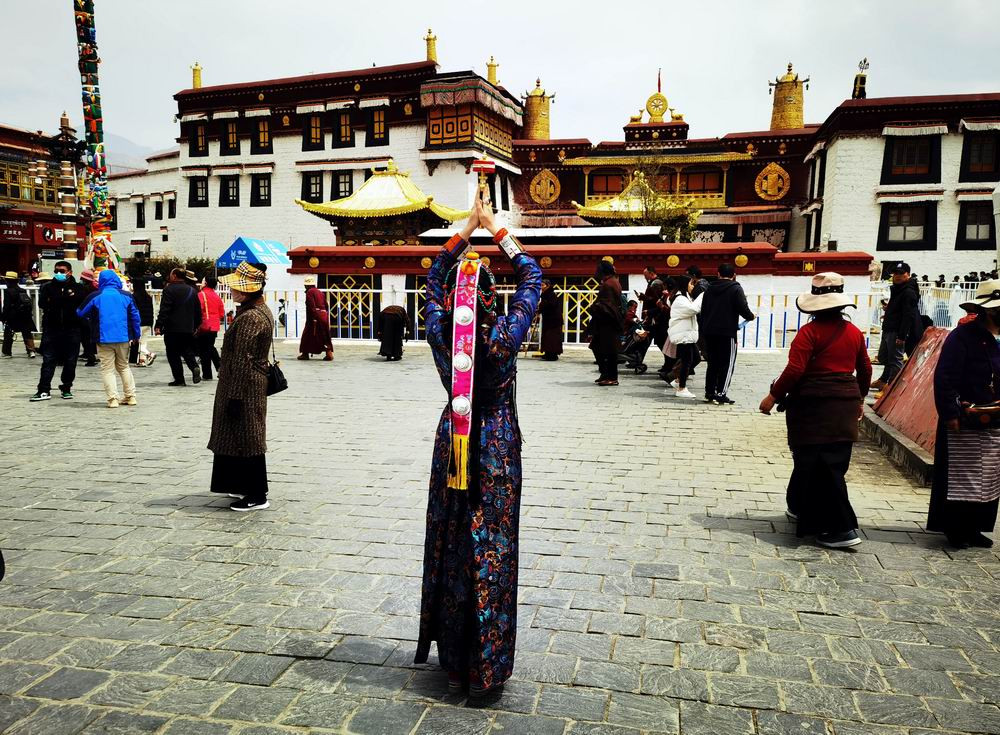 八廓街最初只是围绕大昭寺的一条转经道,也就是“八廓”。藏传佛教认为,以大昭寺为中心顺时针绕行被视为“转经”,表示对供奉在大昭寺内释迦牟尼佛像的朝拜。照片摄于大昭寺门前。