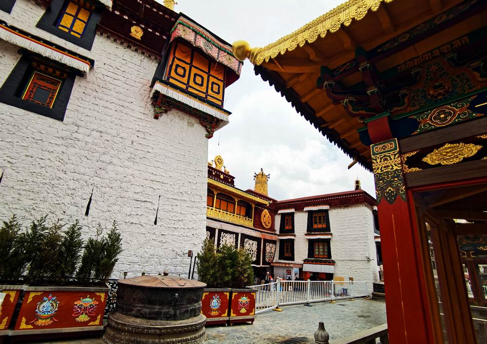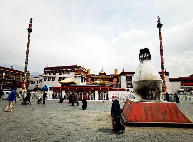 大昭寺,又名"祖拉康"、"觉康"(藏语意为佛殿),位于拉萨老城区中心,是一座藏传佛教寺院,是藏王松赞干布建造。拉萨之所以有"圣地"之誉,与这座佛殿有关。寺庙最初称"惹萨",后来惹萨又成为这座城市的名称,并演化成当下的"拉萨"。照片摄于大昭寺门前。