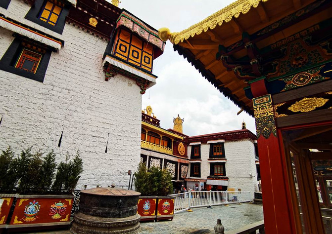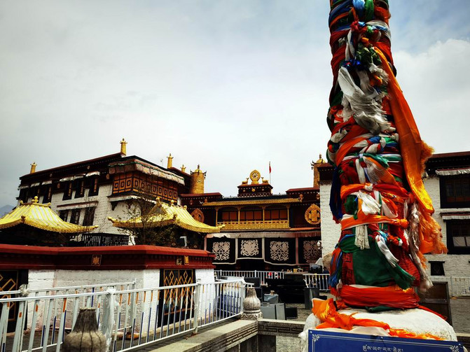大昭寺已有1300多年的历史,在藏传佛教中拥有至高无上的地位。藏族人民有一个"先有大昭寺,后有拉萨城"的说法,大昭寺在拉萨市具有中心地位,不仅是地理位置上的,也是社会生活层面的。图为远眺大昭寺。