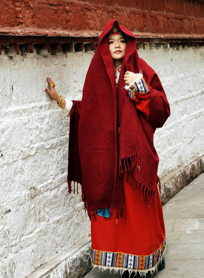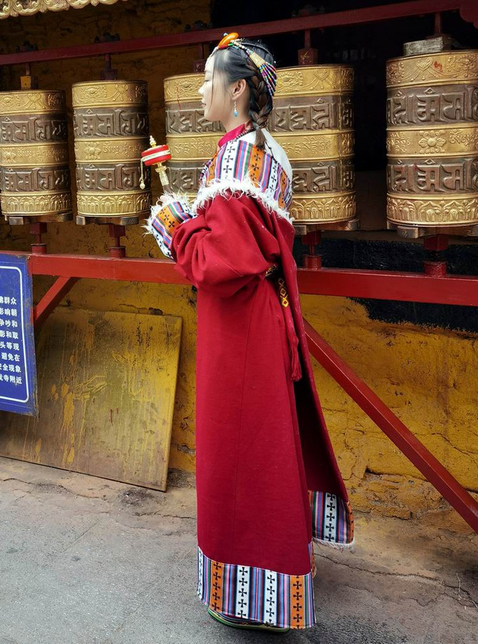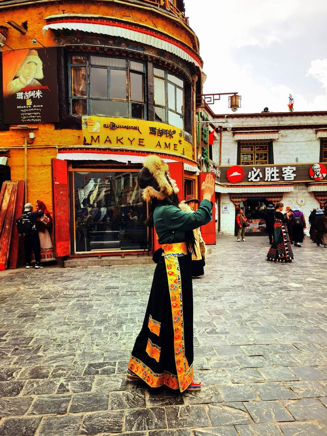藏族人的生活还有节庆的诸多仪式,都依托于大昭寺及四周圣物古迹展开,譬如传统上藏族姑娘的成人礼,女孩的父母会为她准备丰富的首饰、腰饰,还有用珍珠做的“巴珠”,在觉牙达金前举行一个简单的仪式。照片摄于大昭寺门前。
