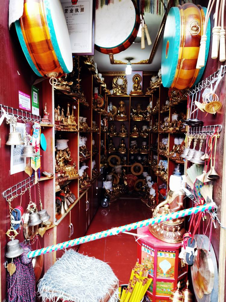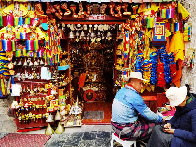 八廓街充分展示了拉萨古城的原有风貌,这里除了一些本地的老住户以外,还有一些定居拉萨十多代的穆斯林和尼泊尔侨民。这里临街的房子几乎都是商店,流动的货摊超过千家,它们经营大小各异的转经筒、藏袍、藏刀、宗教器具等各式用品,还有从印度和尼泊尔远道而来的各种商店。图为八廓街上的商铺。