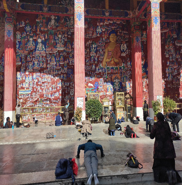 4.稍作休息后14:30左右,不行去逛大昭寺(收费,现场买85RMB1张门票)、八廓街(免费参观)。环大昭寺内中心的释迦牟尼佛殿一圈称为"囊廓",环大昭寺外墙一圈称为"八廓",大昭寺外辐射出的街道叫"八廓街"即八角街。以大昭寺为中心,将布达拉宫、药王山、小昭寺包括进来的一大圈称为"林廓"。这从内到外的三个环型,便是藏民们行转经仪式的路线。寺前终日香火缭绕,信徒们虔诚的叩拜在门前的青石地板上留下了等身长头的深深印痕。晚餐就在附近找一家藏餐厅,尝尝当地的藏式晚宴。