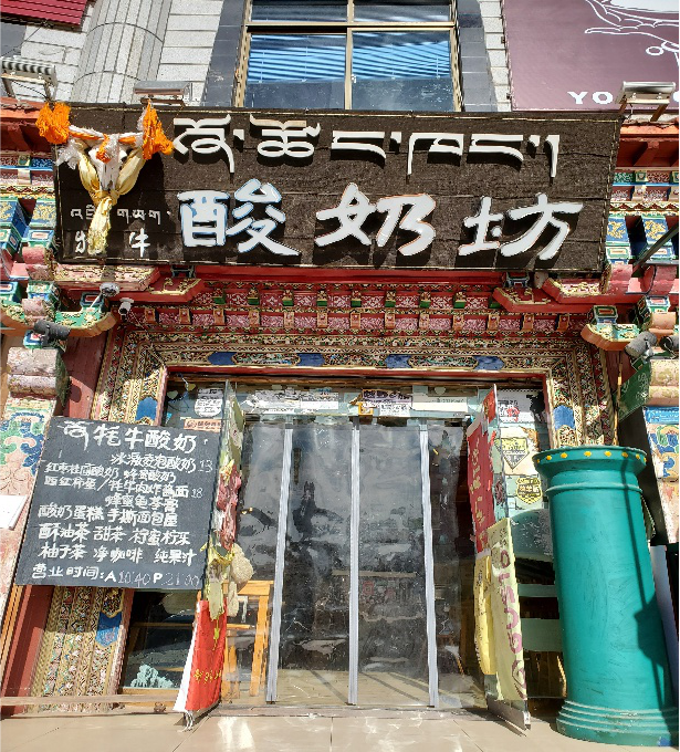 3.游玩布达拉宫下来差不多13:00左右,可以吃个午饭,休息休息补充能量。在这里推荐一下牦牛酸奶坊,就在布宫出来后有停车场那里,现在是个非常火的网红店了,可以在这里用餐休息。点上一杯冰激凌泡酸奶,再来一份牦牛肉炸酱面,好吃又不贵,感受一下正宗的藏式风味,美得不要不要的!