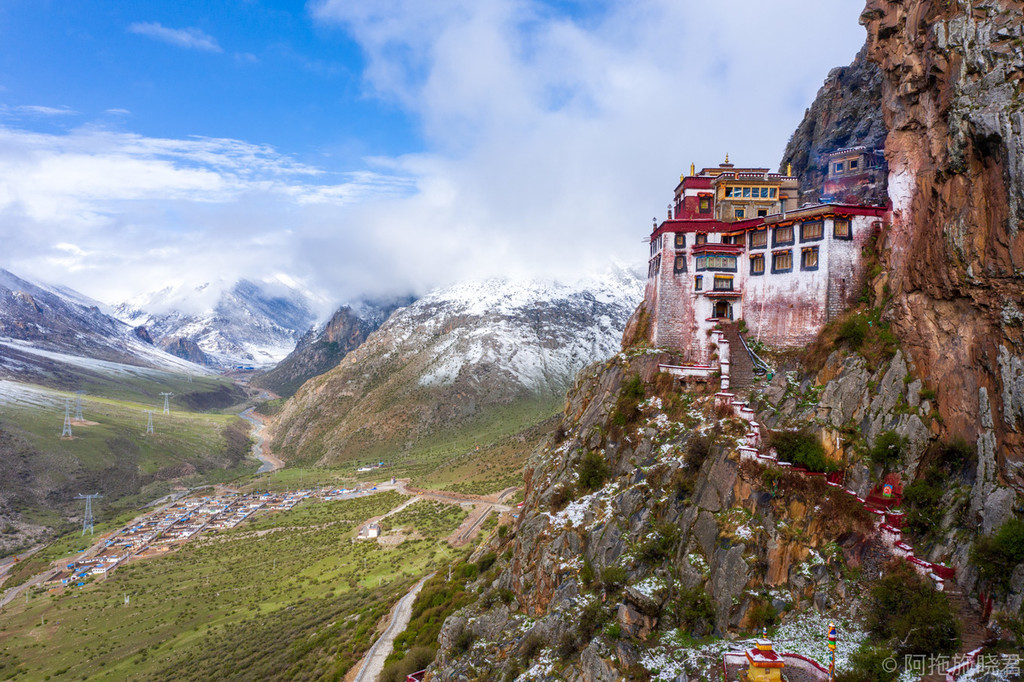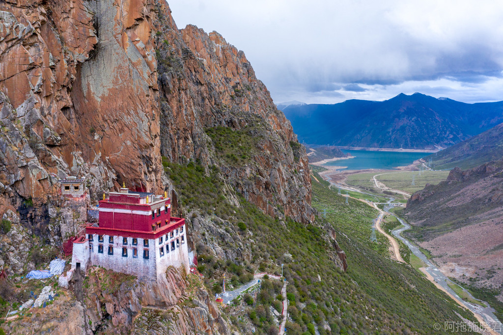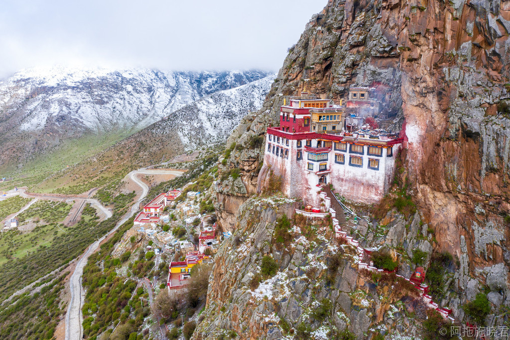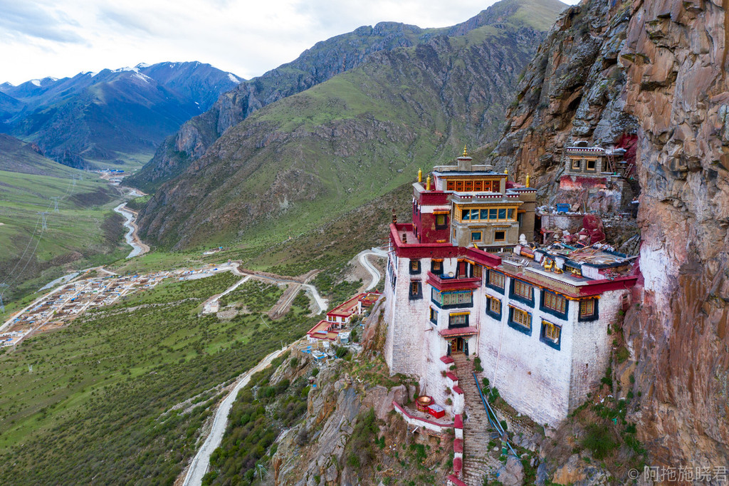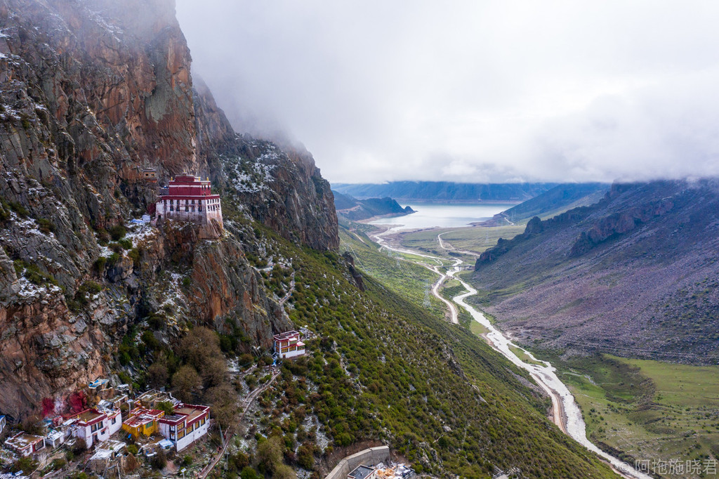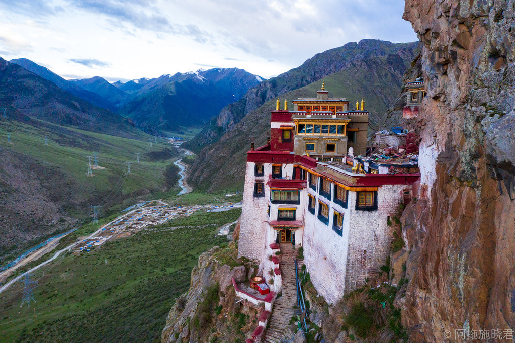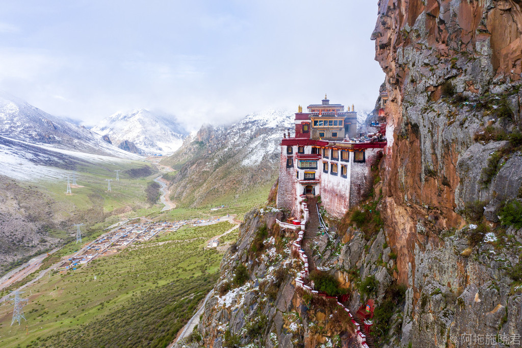 只不过是一个转弯,眼前视野瞬间开阔,看到了远处山上的悬崖寺庙——斯林寺。天啊,这个也太美了吧!看过 拉萨 周边的扎耶巴寺,已经觉得藏族人民也太有智慧了,看到斯林寺,我竟哑口无言。