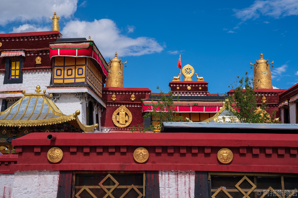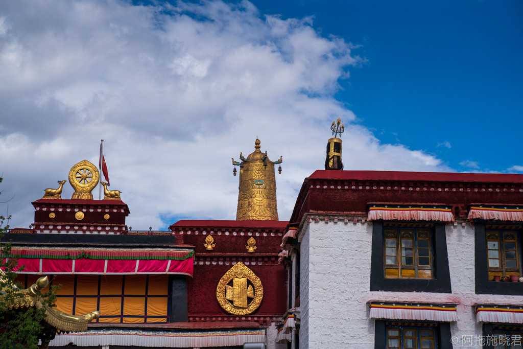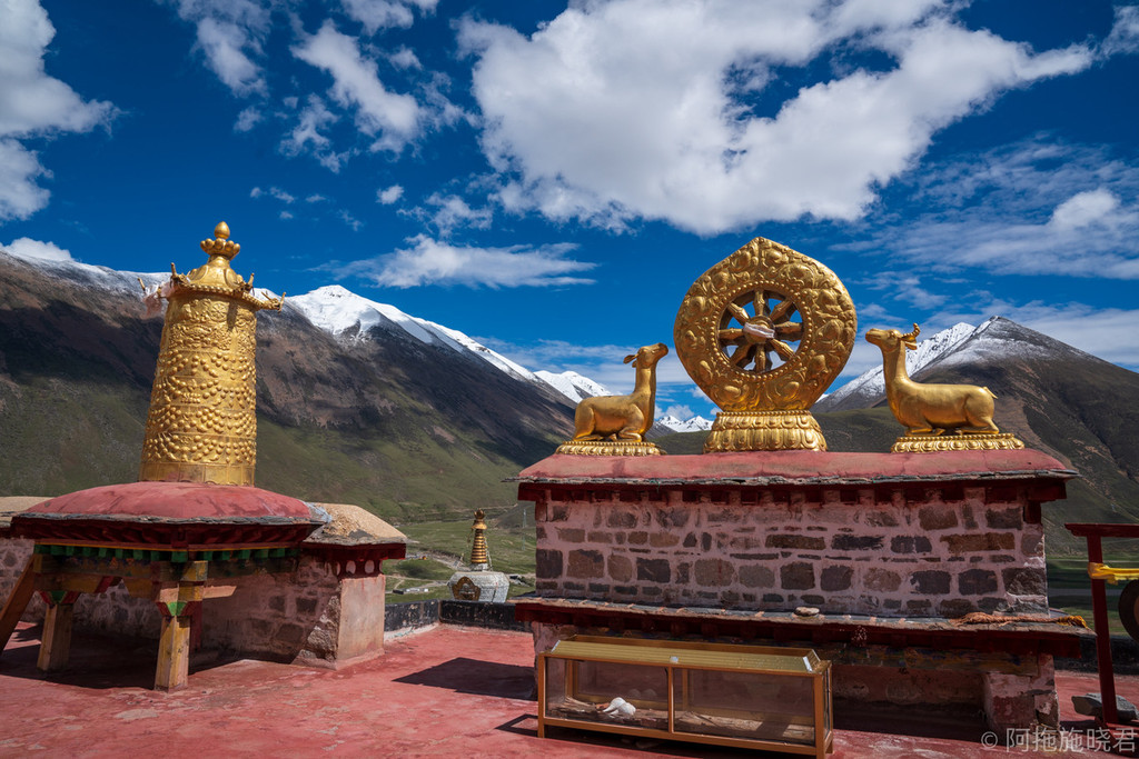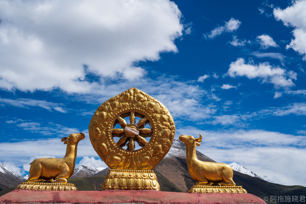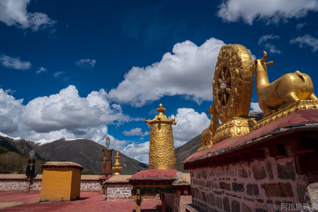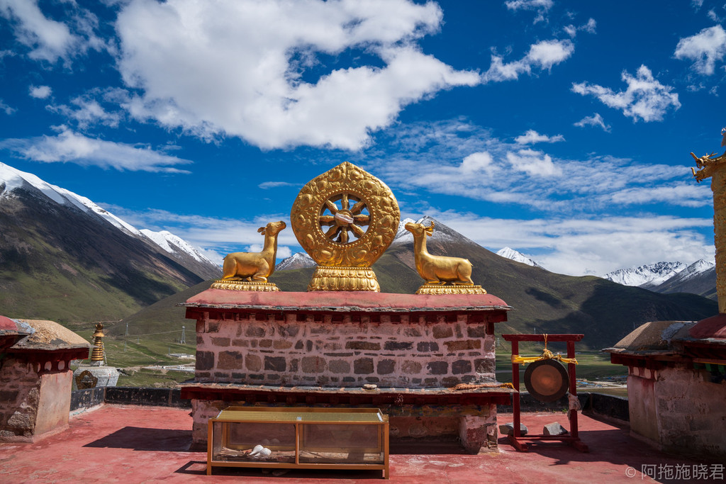 超喜欢寺庙的金顶,神圣庄严的金鹿、法轮,远处的蓝天白云与胜利幢在一起,总觉得很搭。如果想要乘坐公交车来热振寺,可以在每天早上七点半前往 拉萨 东郊车站坐班车。