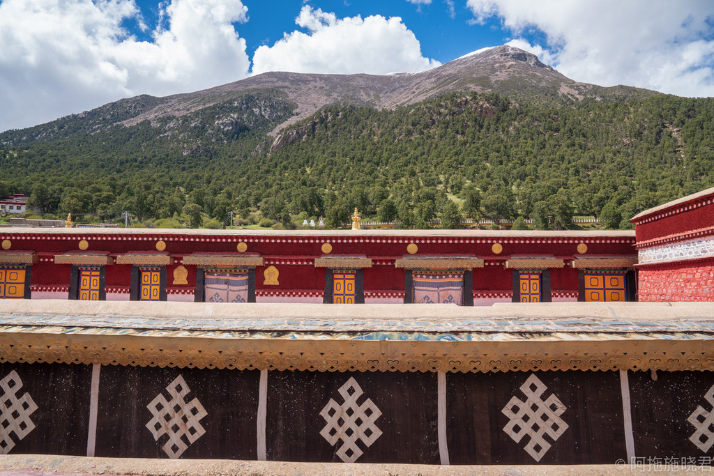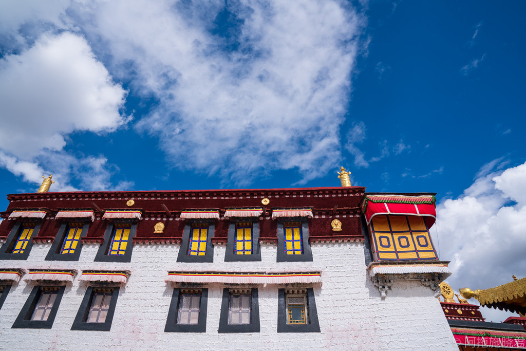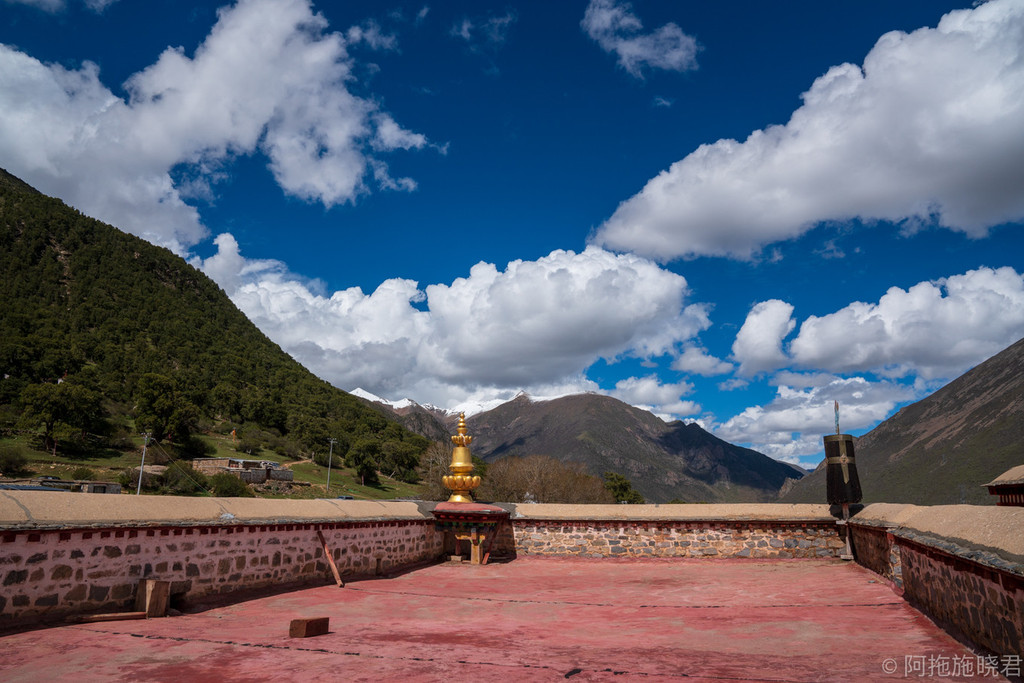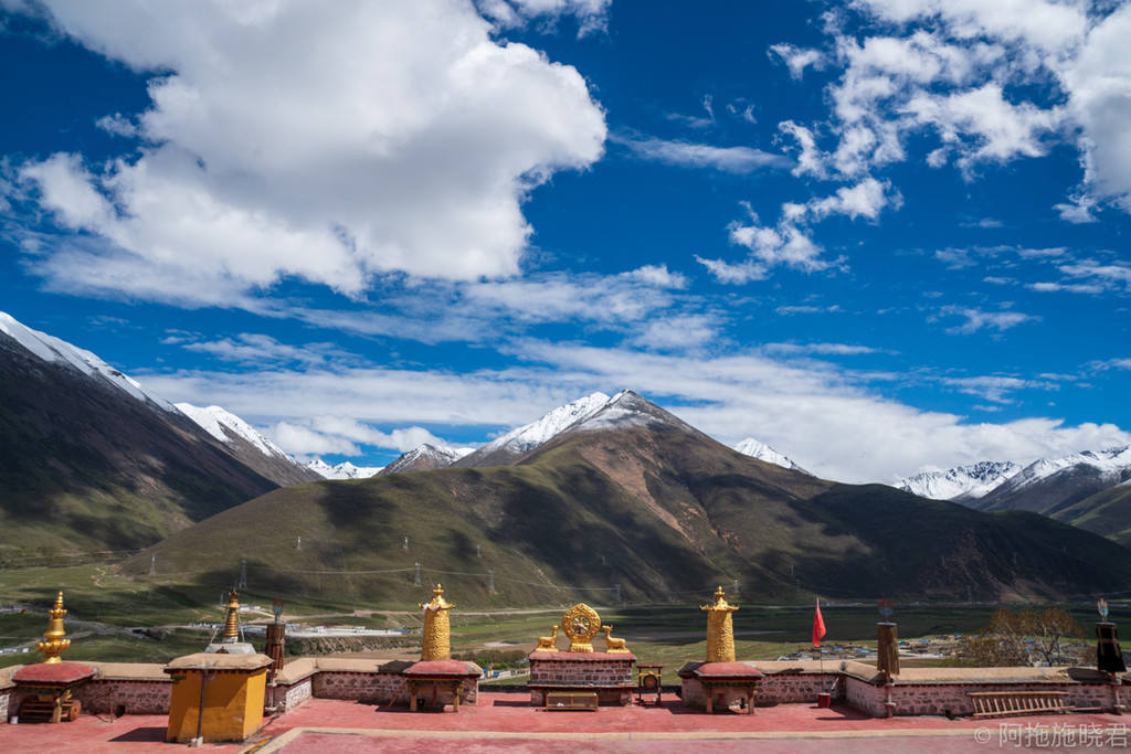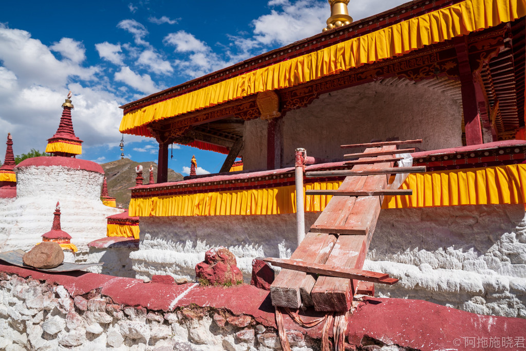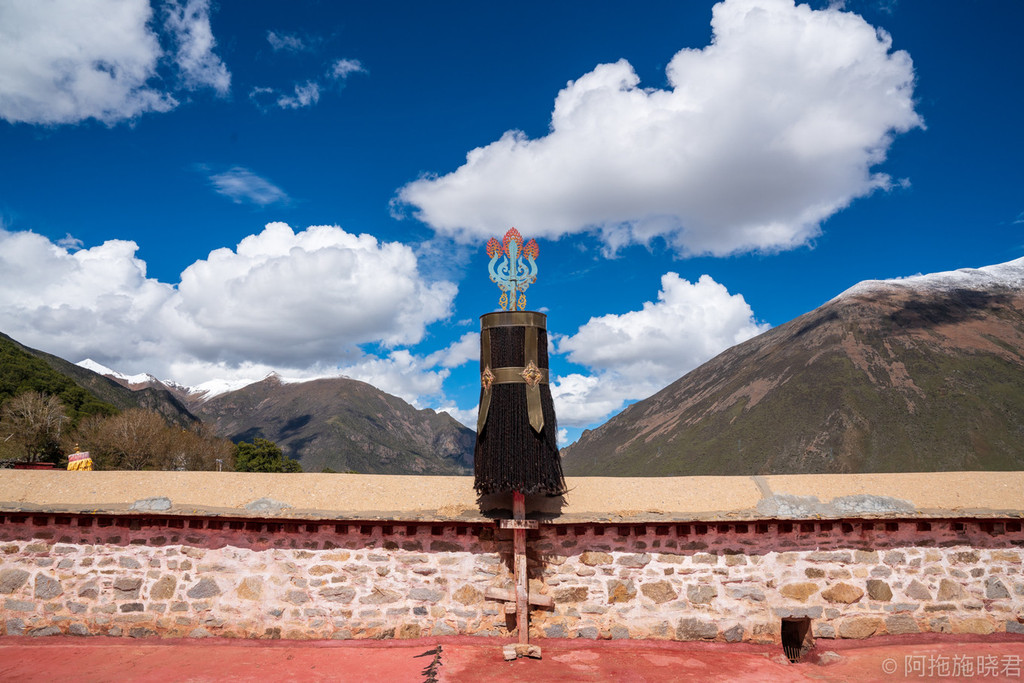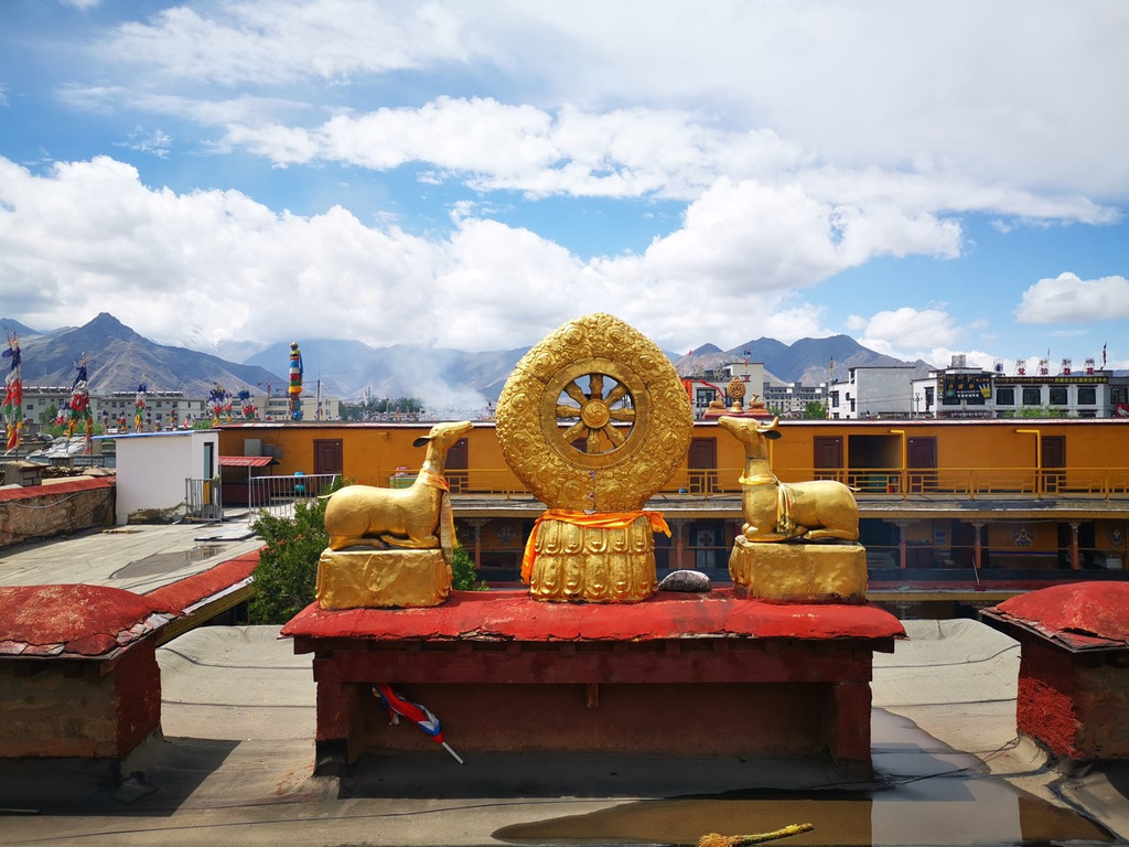 超喜欢寺庙的金顶,神圣庄严的金鹿、法轮,远处的蓝天白云与胜利幢在一起,总觉得很搭。如果想要乘坐公交车来热振寺,可以在每天早上七点半前往 拉萨 东郊车站坐班车。
