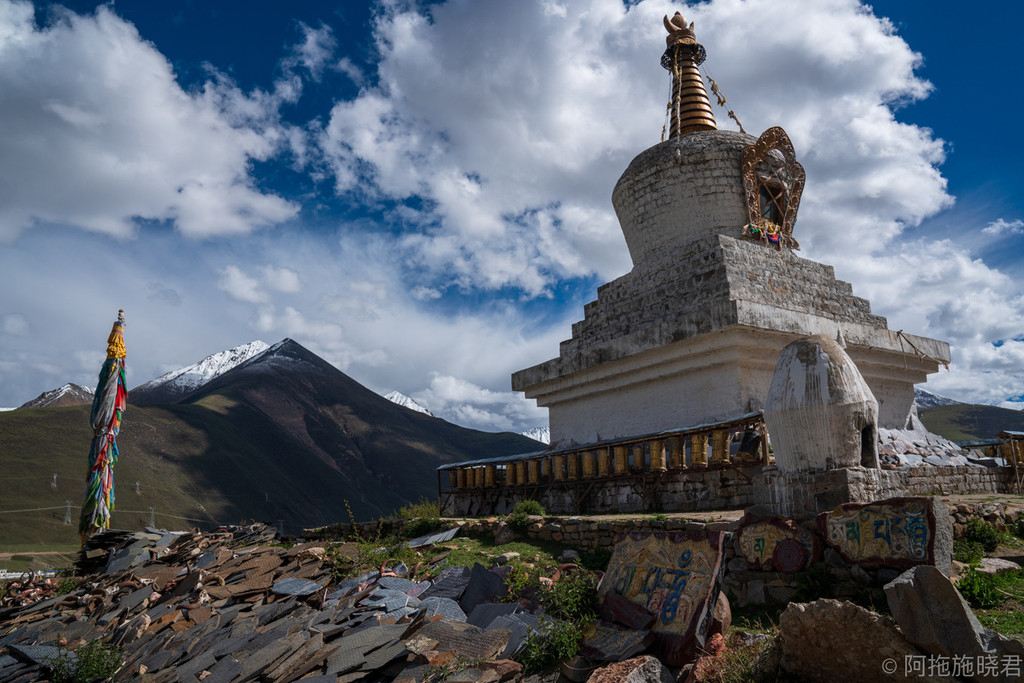 一开始天气不怎么样,都是阴阴沉沉的,不过远处的蓝天依然还在。就在我们转经过程中,太阳一点一滴地突破云层,最终呈现在我们眼前的是蓝天白云雪山下,那光鲜亮丽且又纯白洁净的佛塔。