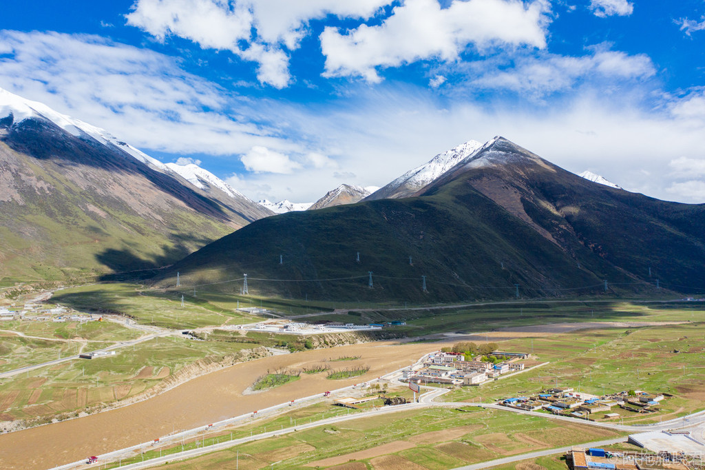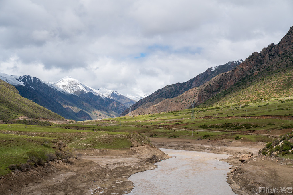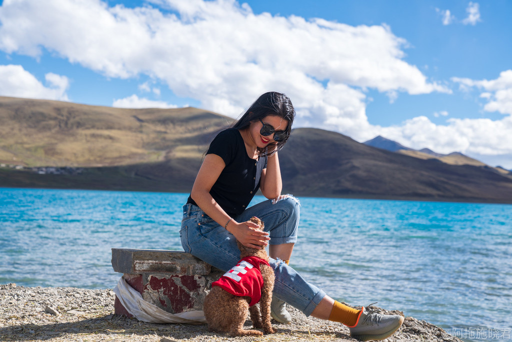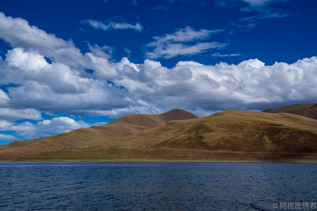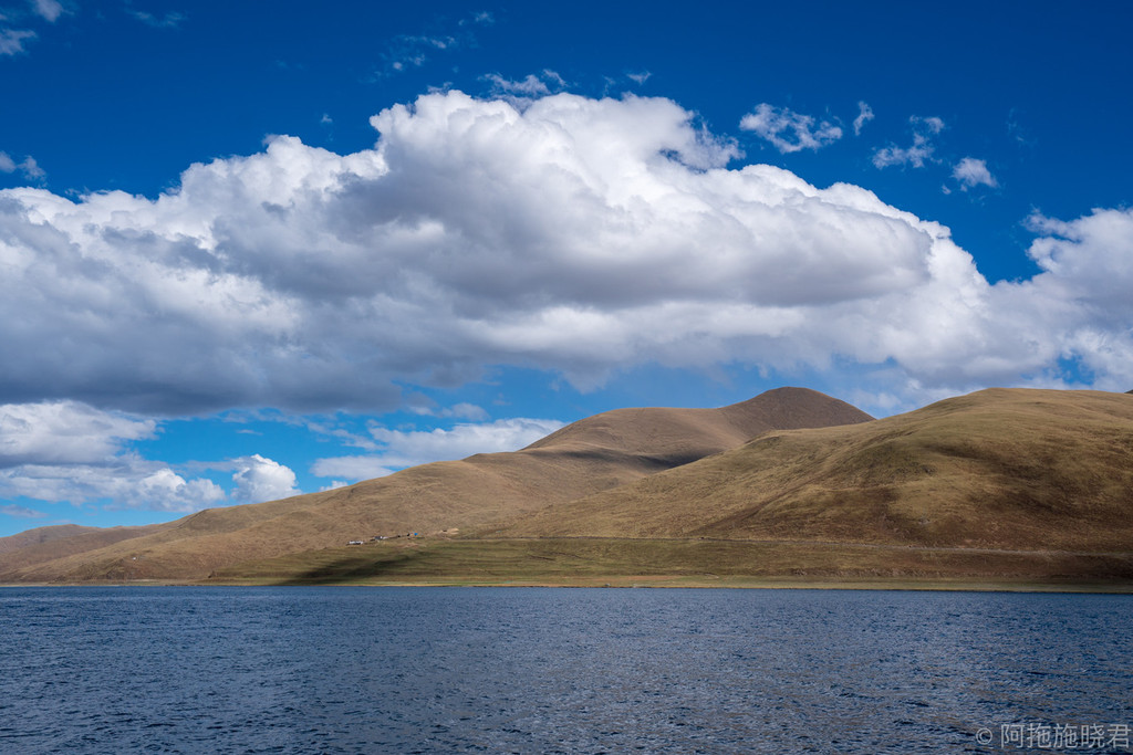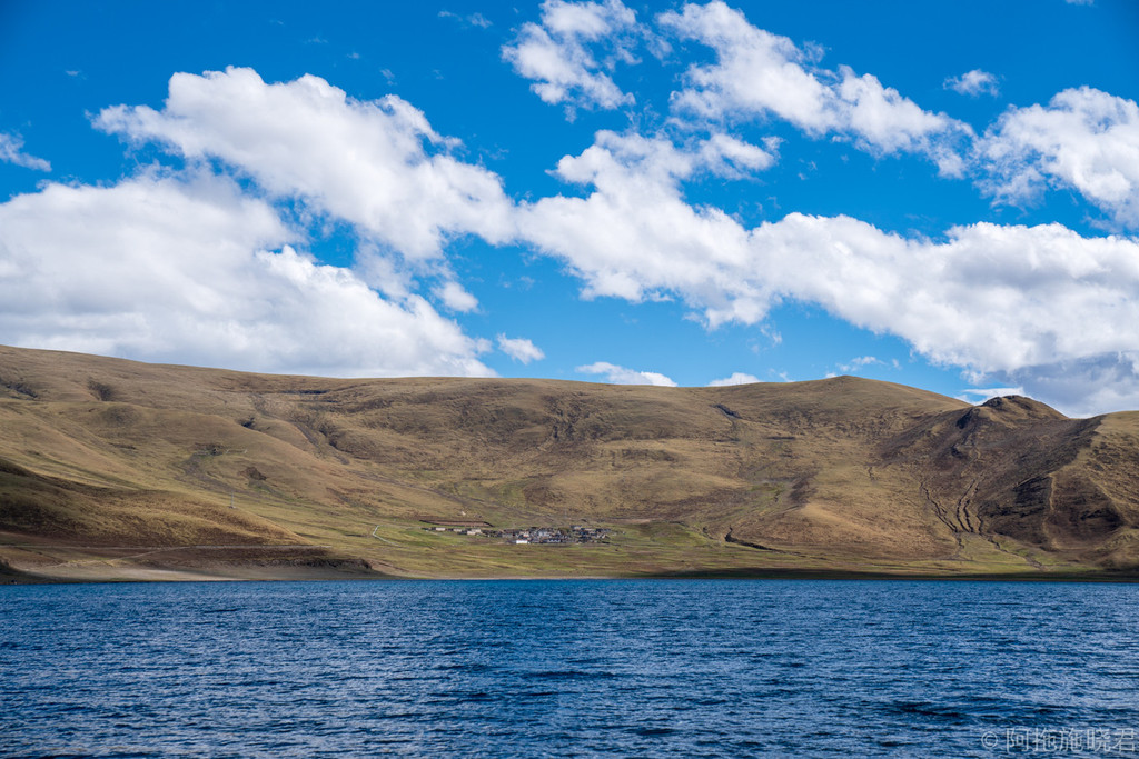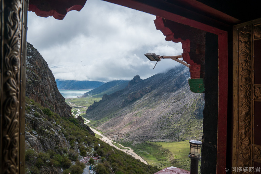 羊湖最美的还是日托寺那一片。正常我们看到那条蓝色丝带是翻越岗 巴拉 山口可以拍到的,还没到垭口的地方还能遇到常年待在那里的藏獒,可以合个影。