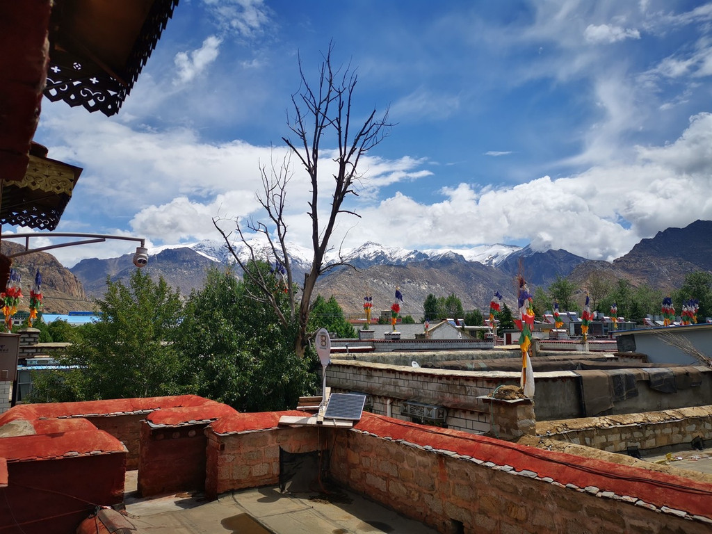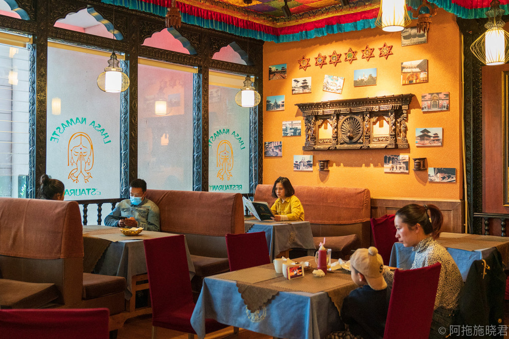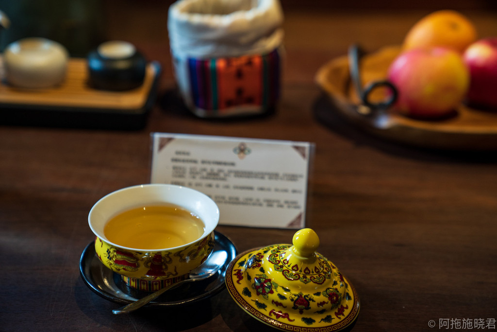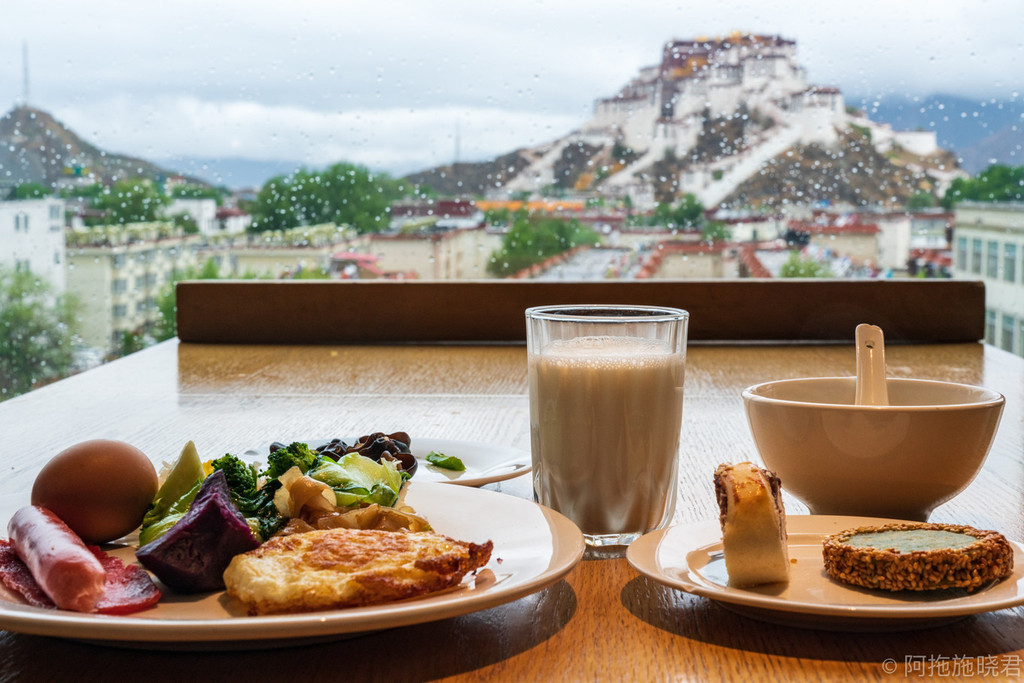 我最喜欢的是尼桑辰波商场的楼上,入口不是很好找,它距离大昭寺金顶很近,宏伟的布达拉宫也就在眼前。甜茶喝腻了有时候也会点上一壶清茶,就是用砖茶加上盐泡出来的茶,是咸的。