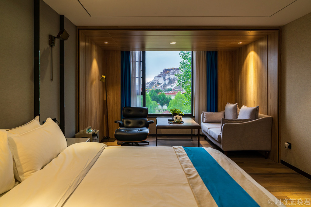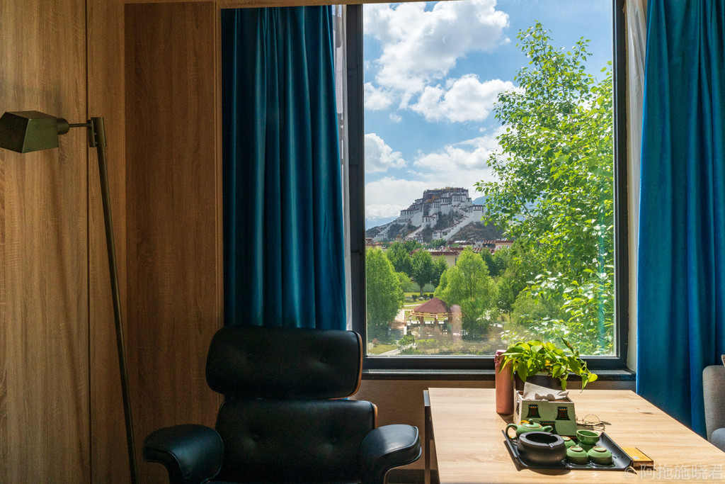最值得一提的还是我的房间,有一个阳台,推开窗,蓝天、白云、雪山和布达拉宫就在眼前。房间很大,估摸着有八十平,独立舒适的全天候供氧的卧室,采光超级好的客厅,还有一处写字桌能让我静心写作。