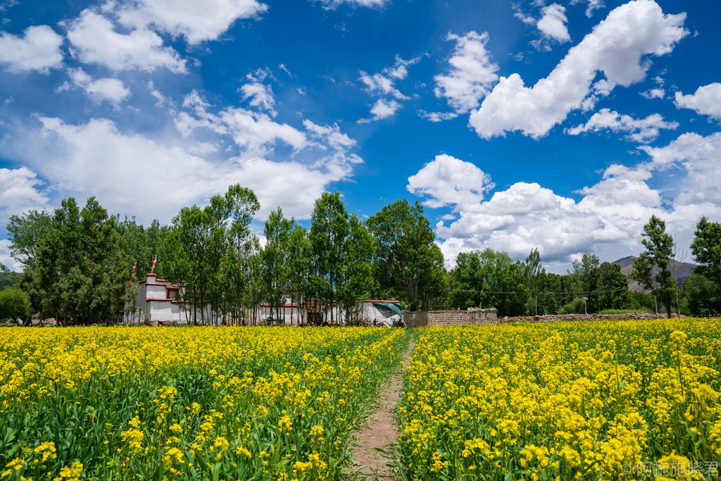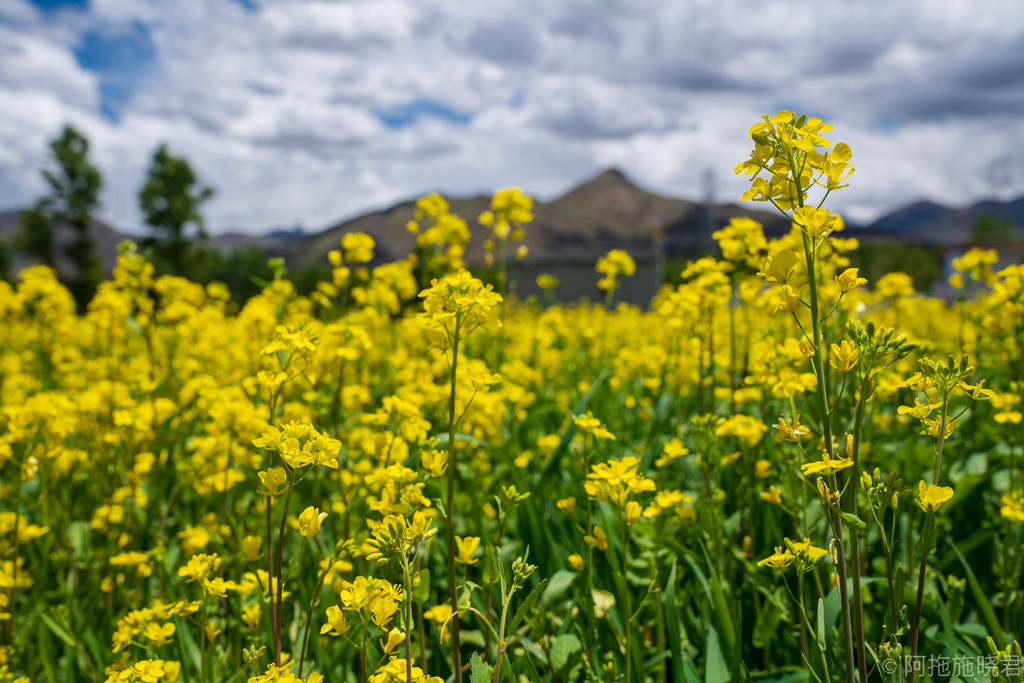因为我们俩说实话没有归期,去哪里都可以,所以路线很随性。在路上,突然间遇到一片油菜花,直接就停下来呆了许久。高原上的油菜花实在是赋予了这片金黄最美的背景,少见得到的树与房屋,远处绵延的山脉与蓝天白云,漫步在这一片油菜花田间,第一个感觉是舍不得离开。