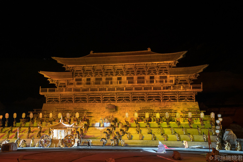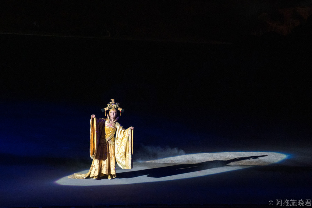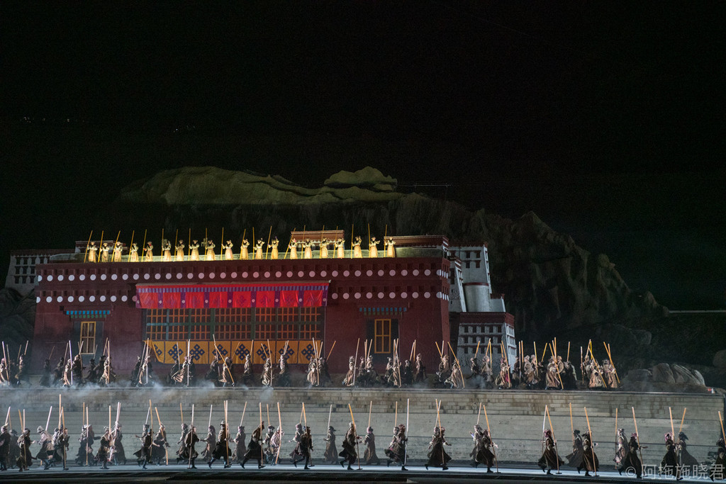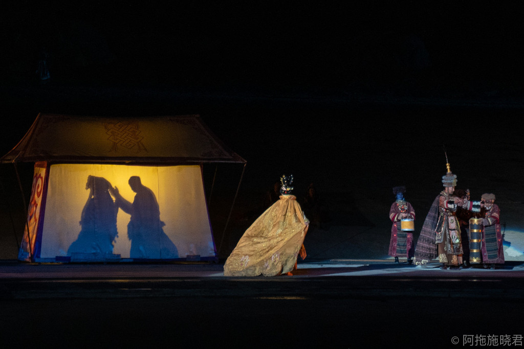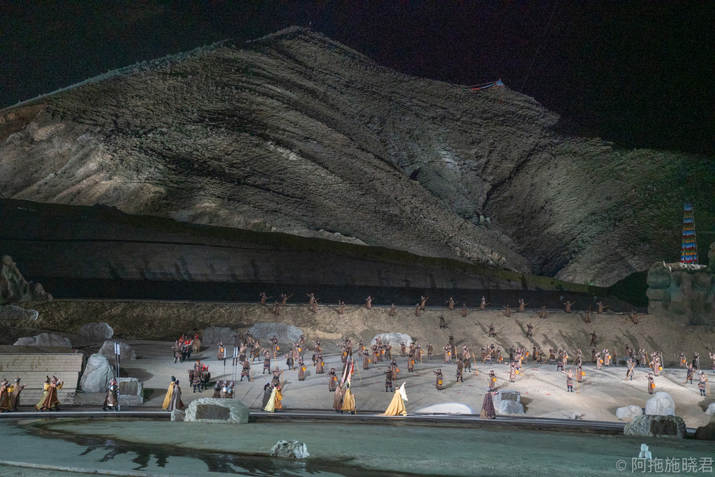 这是一场以山川为景,一抬头还能看得到星空的室外演出场景,讲述着 文成 公主与松赞干布和亲的故事。我会来看 文成 公主,更多的不是因为它的故事情节,超爱藏族人民的舞蹈戏曲。在实景剧里,既可以看到腰鼓舞、打阿嘎、牛皮船舞和藏戏。