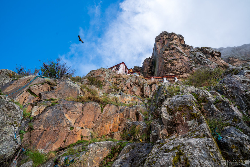 第一次看到斯林寺的照片是在 中国 国家地理杂志上,当时拍了下来,在心里种了草。亲眼见到悬崖峭壁上的斯林寺,还是非常震撼的,这是达隆噶举派的修行圣地,发朋友圈的时候,益西说这像极了的虎穴寺。