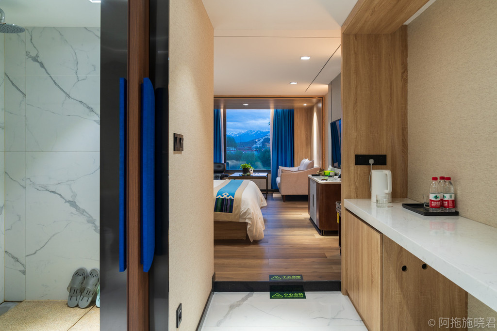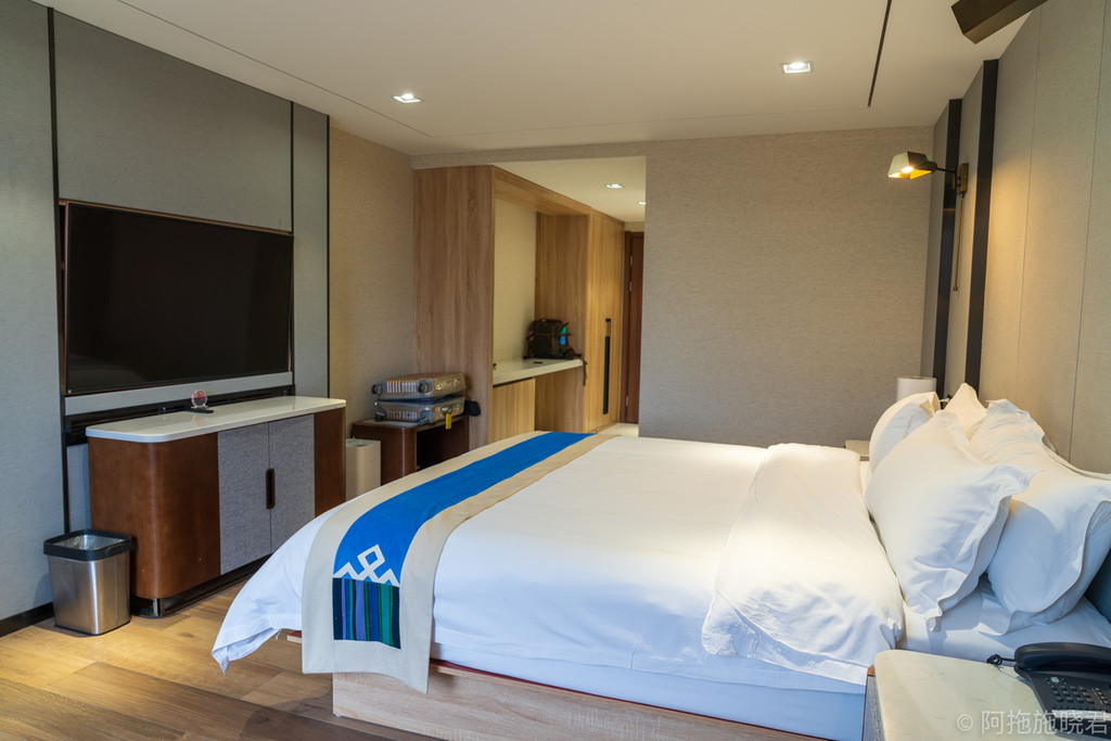 房间里面更是应有尽有,供氧机、加湿器、地暖,在高原上最需要的几款东西都有。床品更是无可挑剔,大概是按照五星级的标准来采购的,卫生间是干湿分离的,我最喜欢也是最方便的设计。