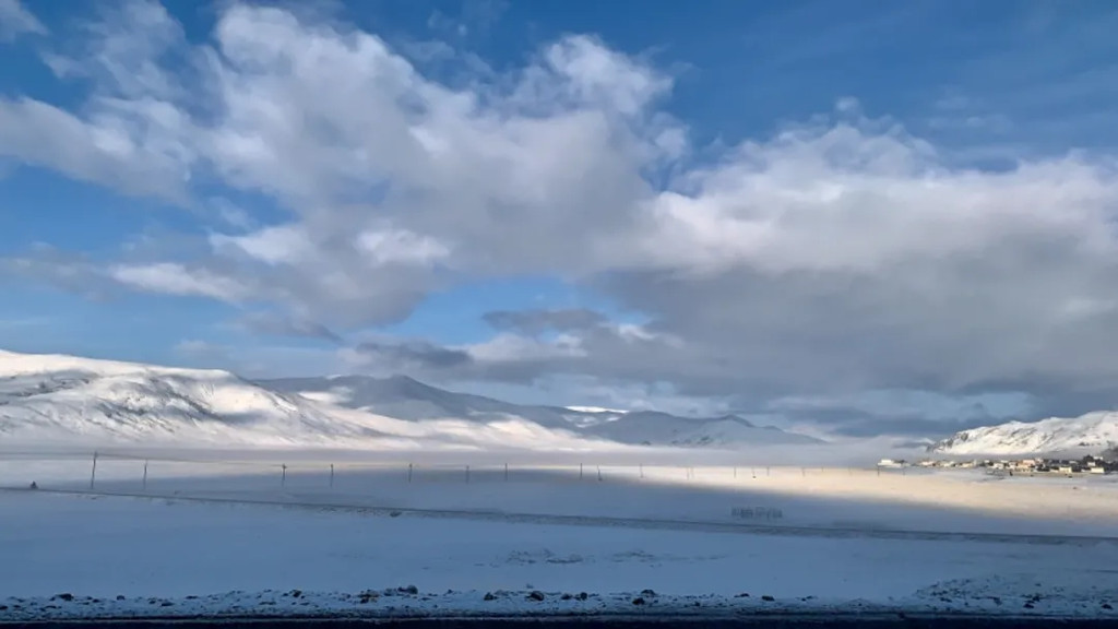 一觉醒来,继续保持头痛。早晨7:30出发,一路继续向西。路上真的没有车,就别说人了。翻过第二座山的垭口,忽然眼前白雪皑皑,穿越般地进入了冰天雪地。