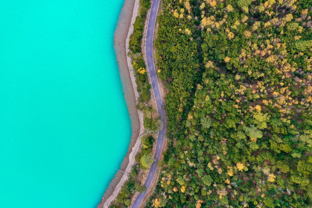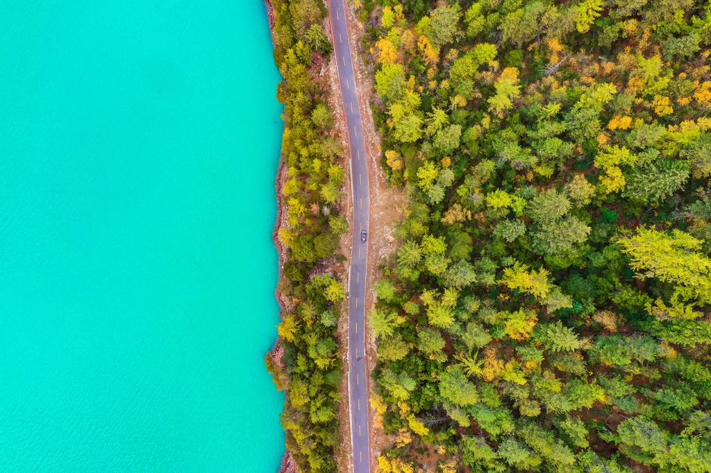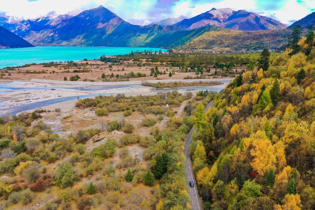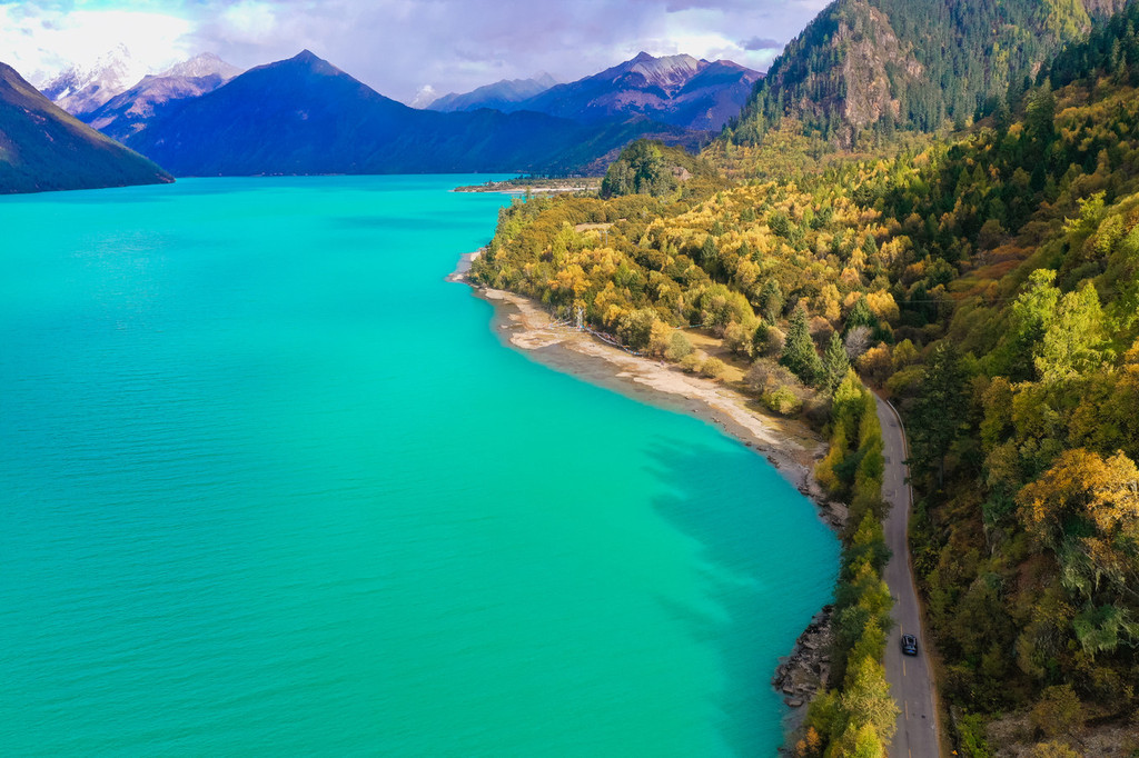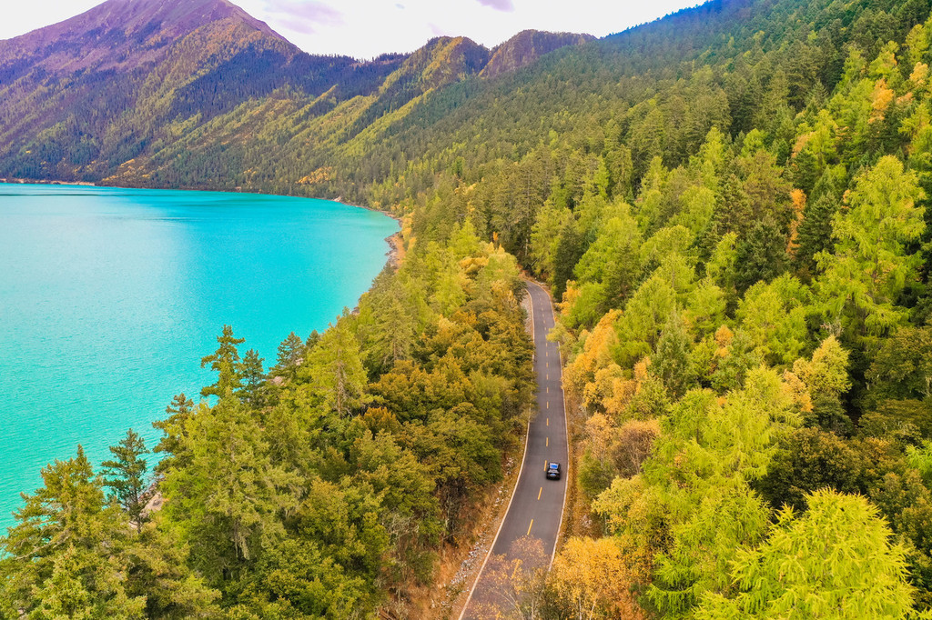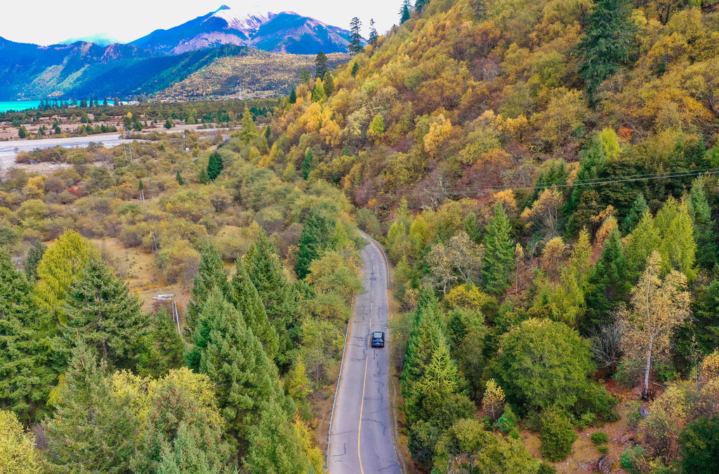 湖边是彩林和雪山,沿着湖边的公路一直往景区深处开去,特别有感觉。