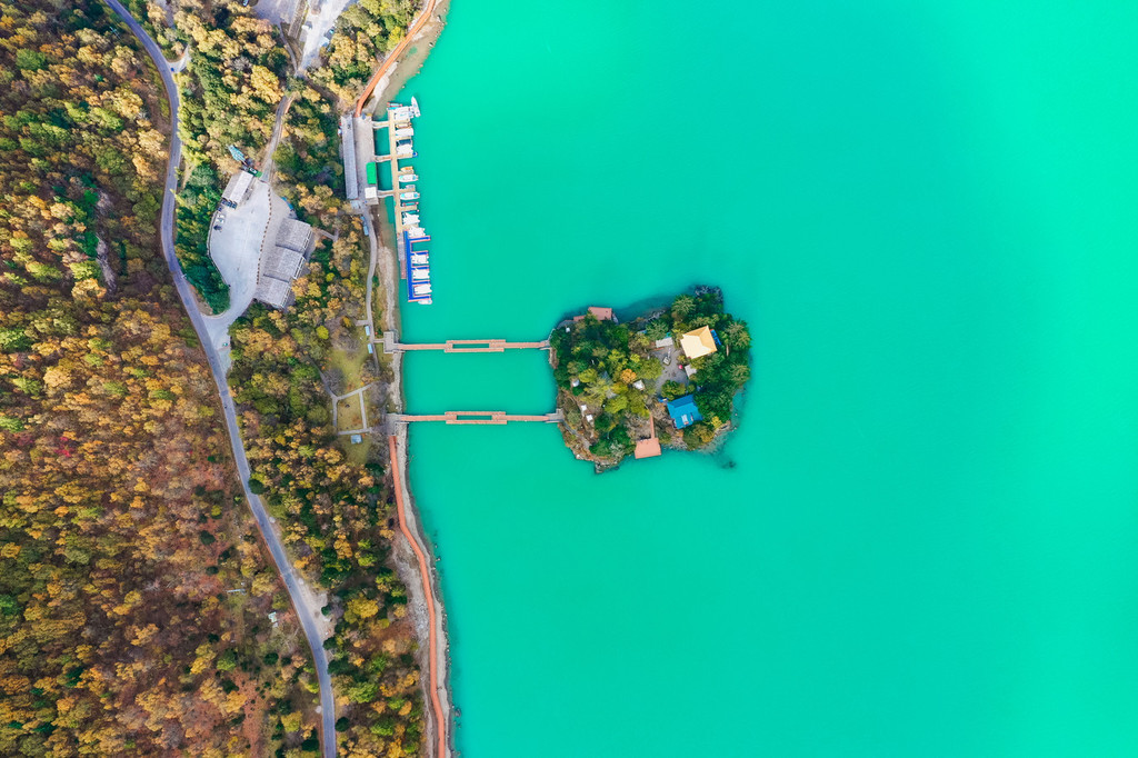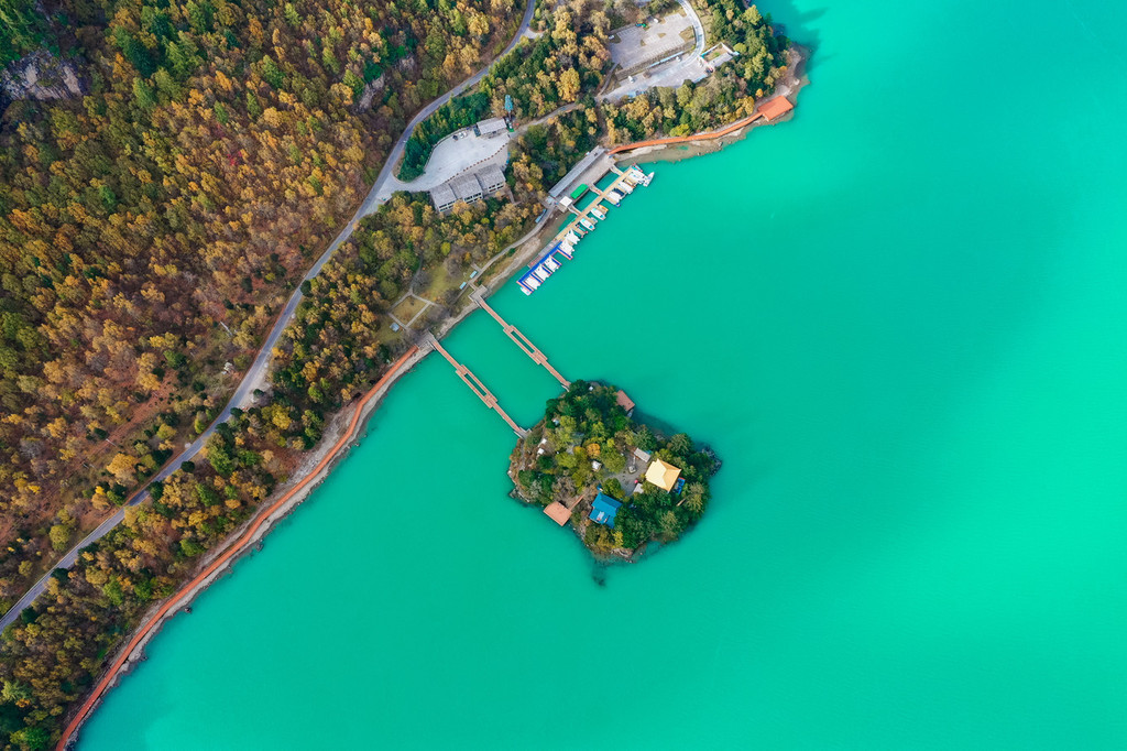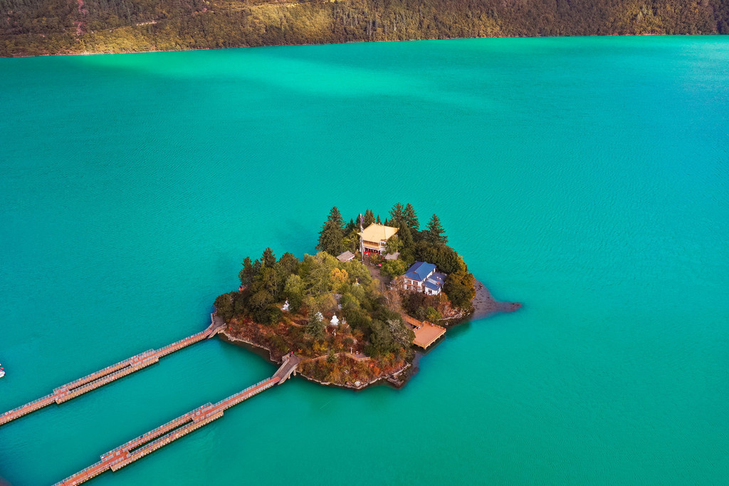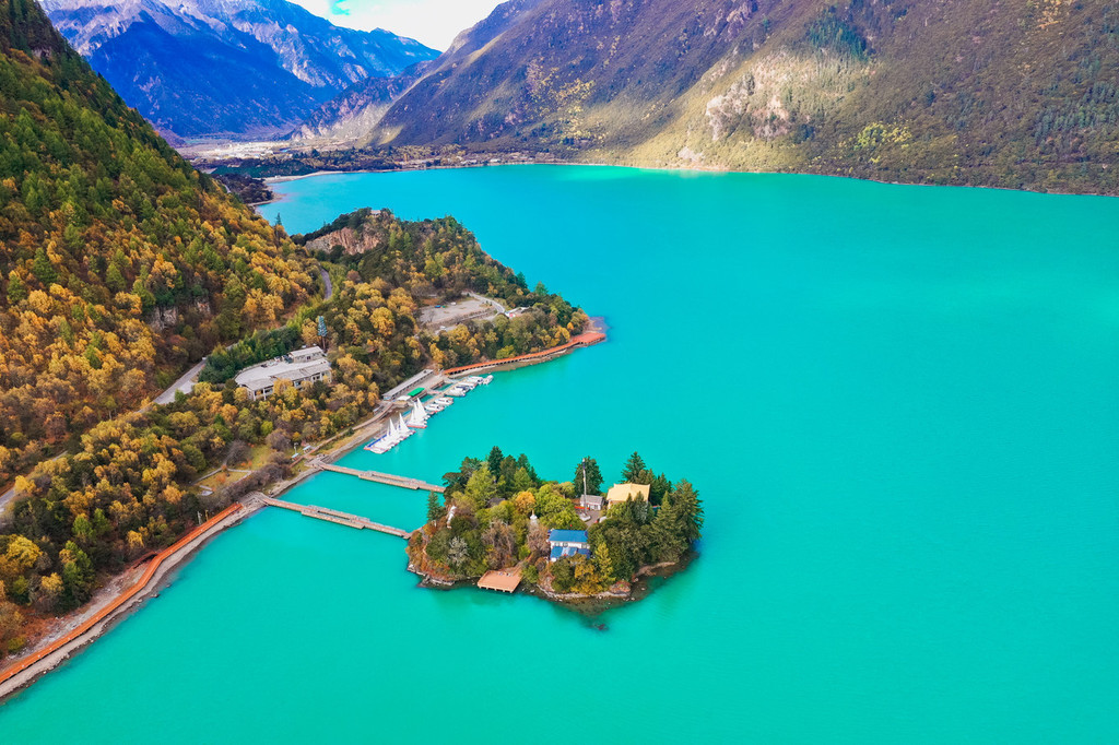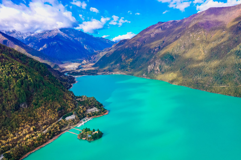 巴松措最独特之处就在于湖心有一座小岛,名叫扎西岛,岛上有一寺庙,叫措宗贡巴寺,远眺坐落于湖心的扎西岛,两岸的湖光风景映入眼帘,仿佛置身于人间的仙境。
