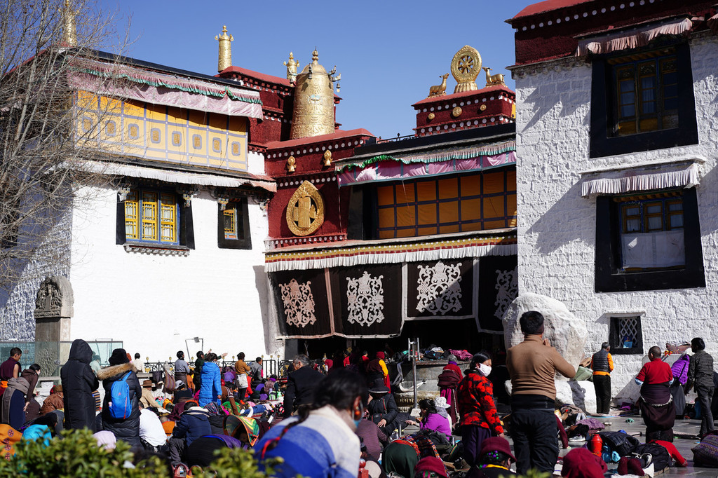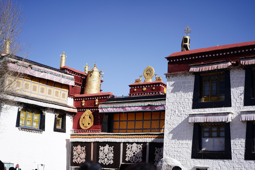 主殿三层,殿顶覆盖着 西藏 独具一格的金顶,阳光下浮光耀金。