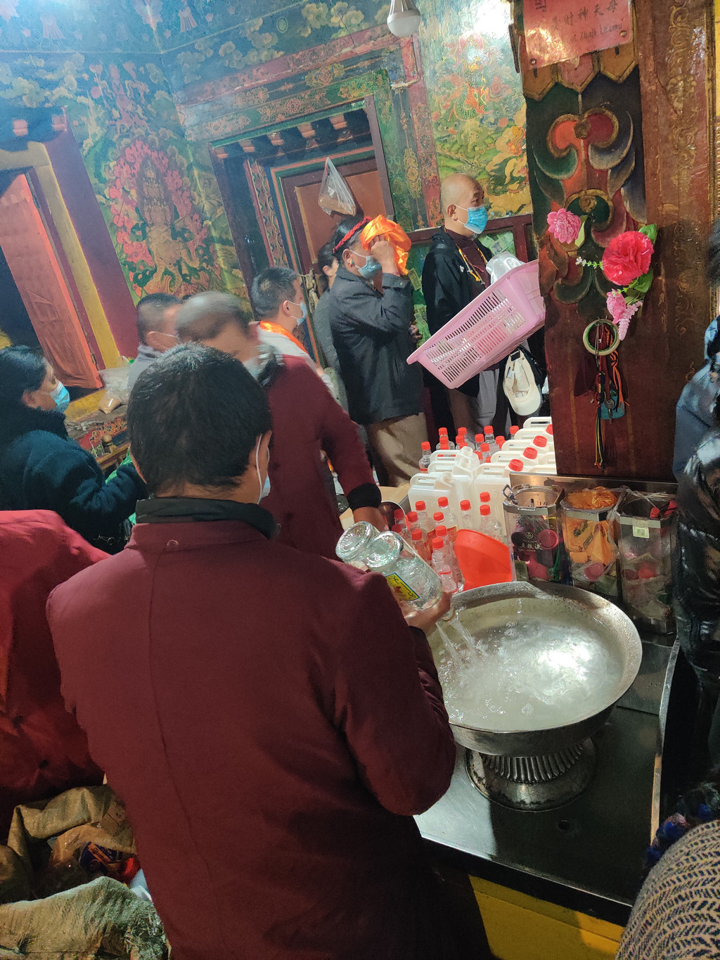 。扎基寺,不愧是财神庙,一切向钱看,门口卖的酒倒进这个大盆里,盆满之后,倒酒的工作人员就开始直接往刚刚倒完酒的空瓶里用一个勺装酒,然后拿到门口卖。一瓶10元