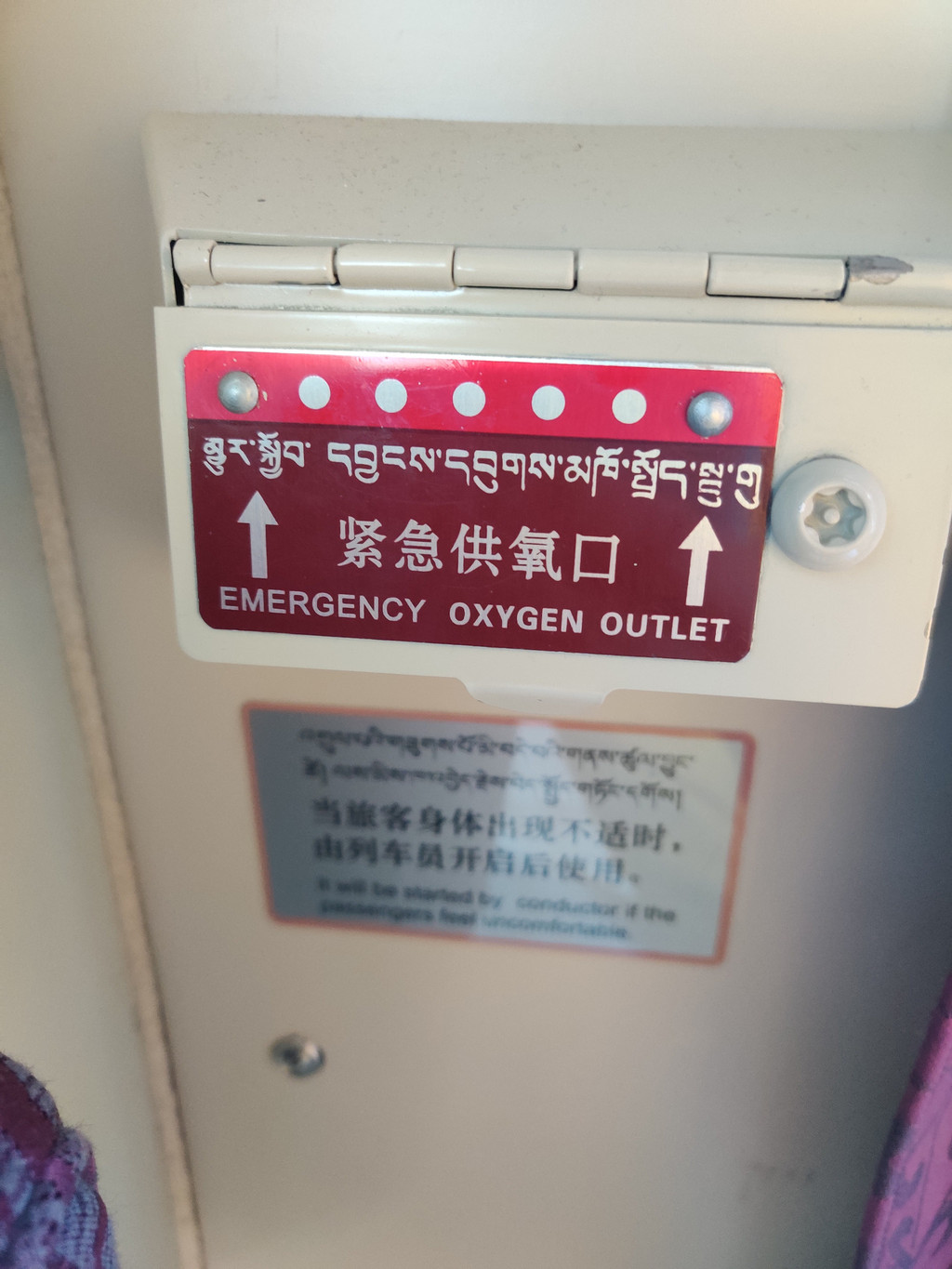 西宁过后,列车上时刻吱吱声,那是氧气孔不停往外增氧,就在靠床铺头靠近枕头的位置。