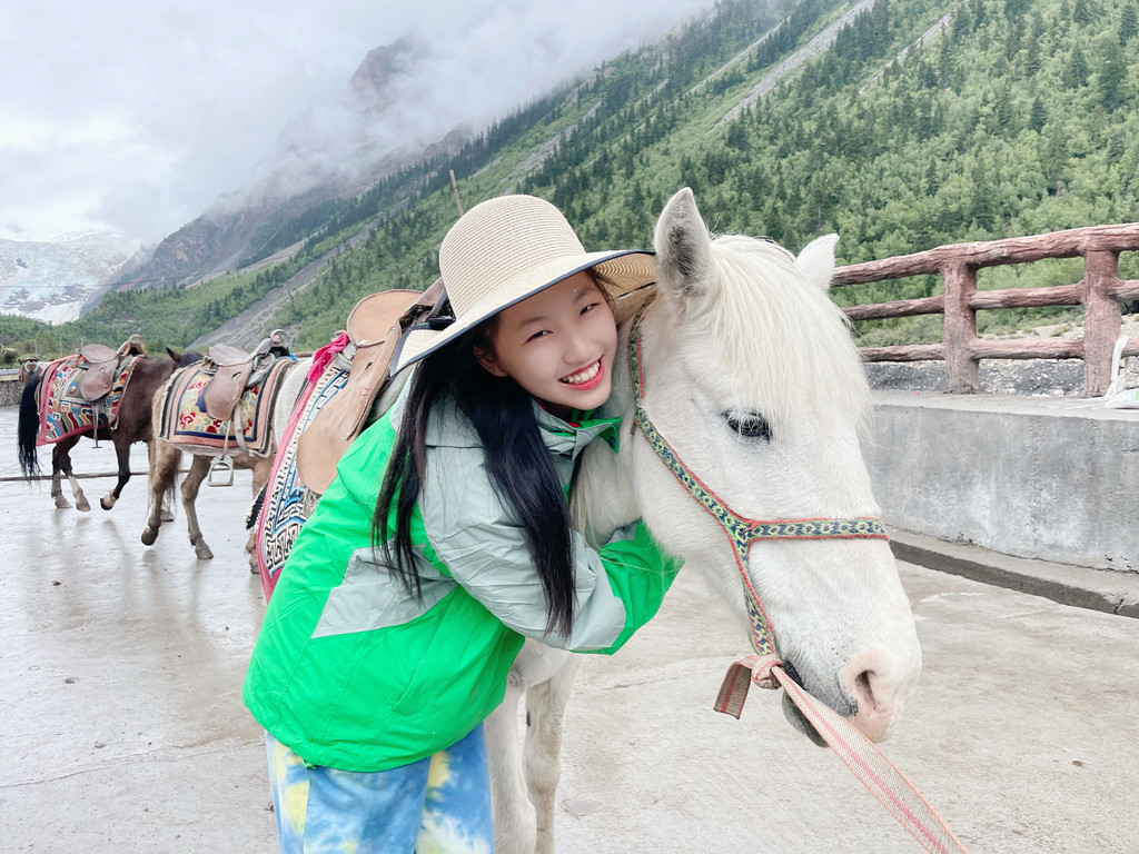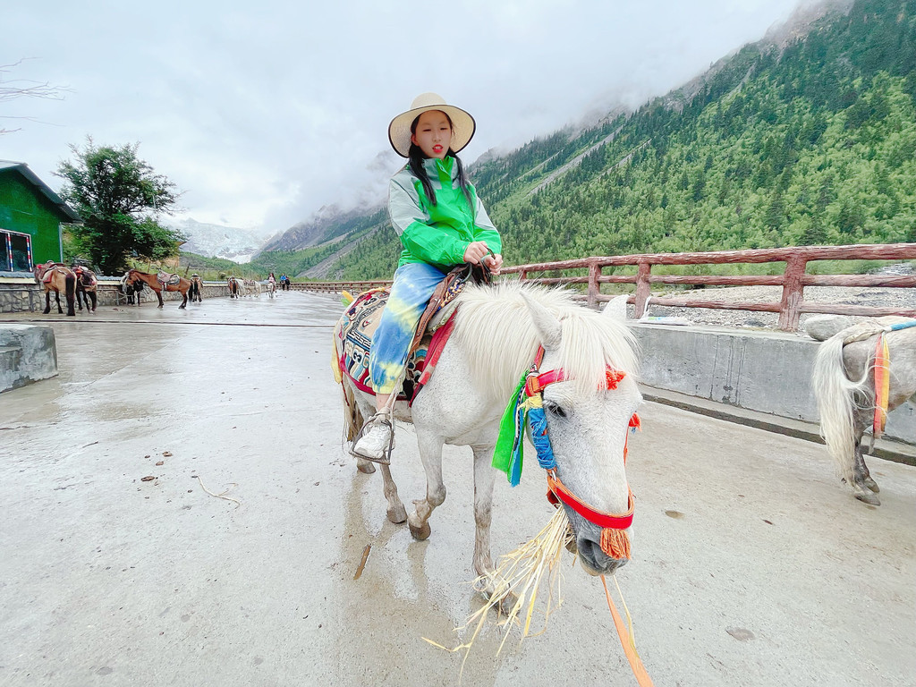 乘坐景区摆渡车到村口,近距离观赏冰川可选择步行,也可选择骑马,骑马是100元每人,往返一小时。