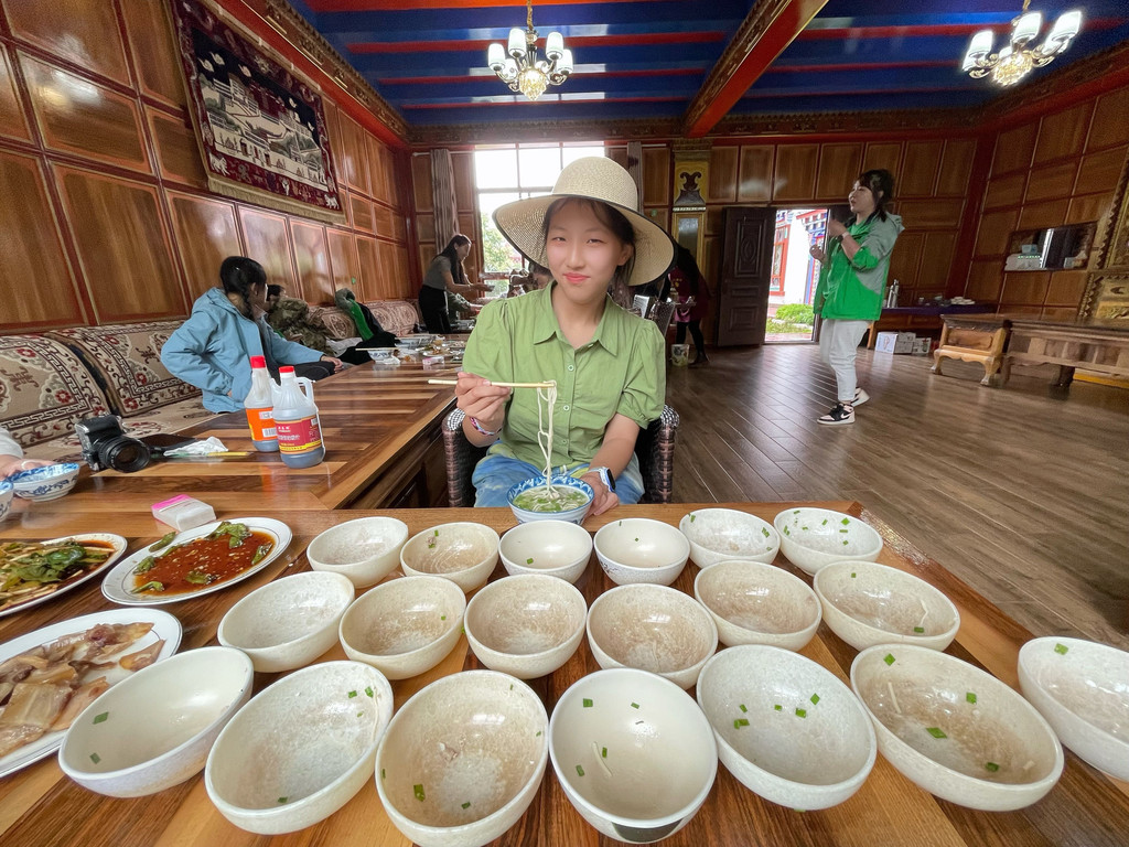 加加面是滇藏地区的特色小吃,每次煮一大碗,装在小碗里,每个小碗也就一口,由服务员分次加,吃完一口加一点,一口一碗,和着肉末烧的,极鲜美,直到吃饱。吃加加面,吃的是一种休闲和娱乐,至于繁琐的服务,是表示对远方客人的欢迎。