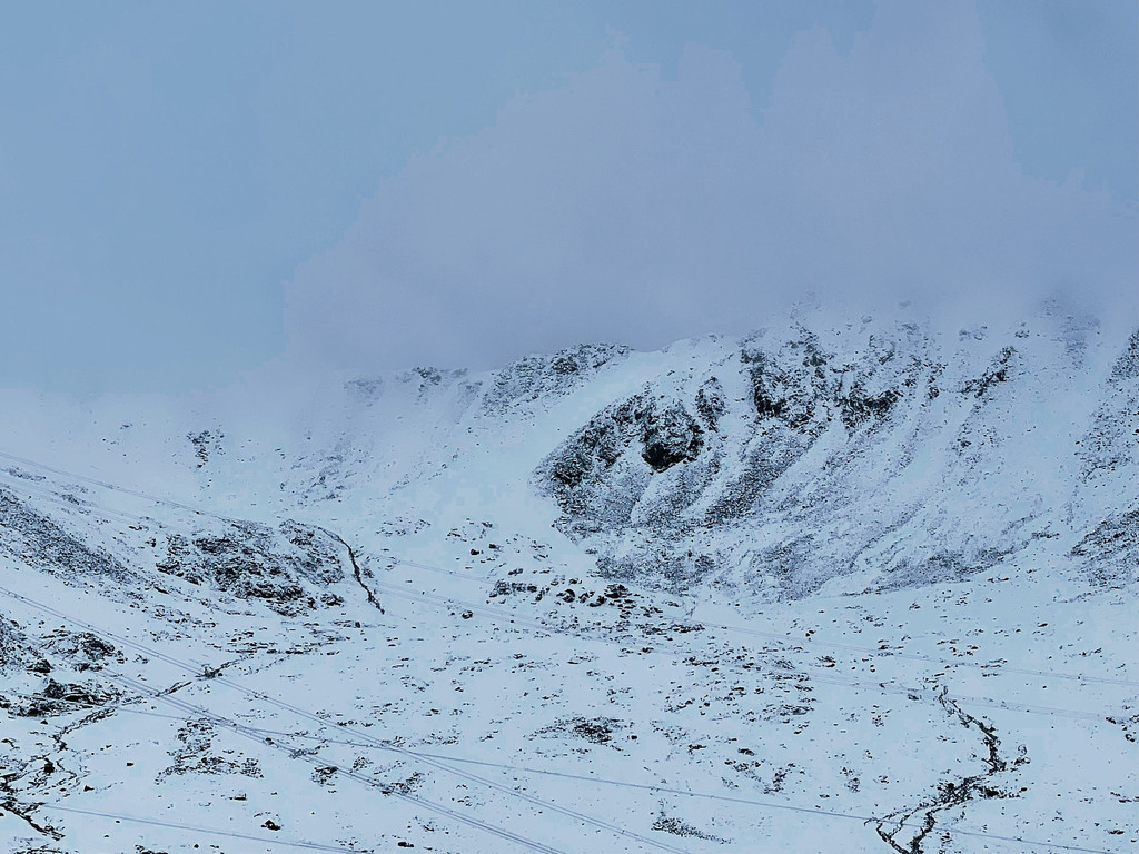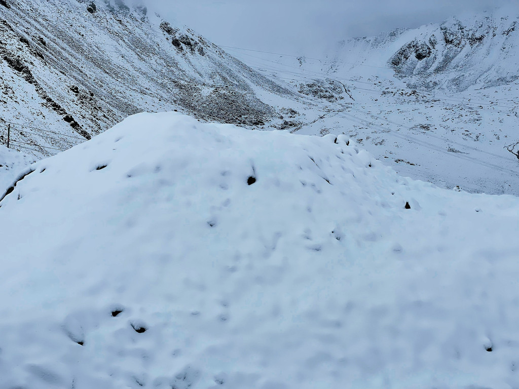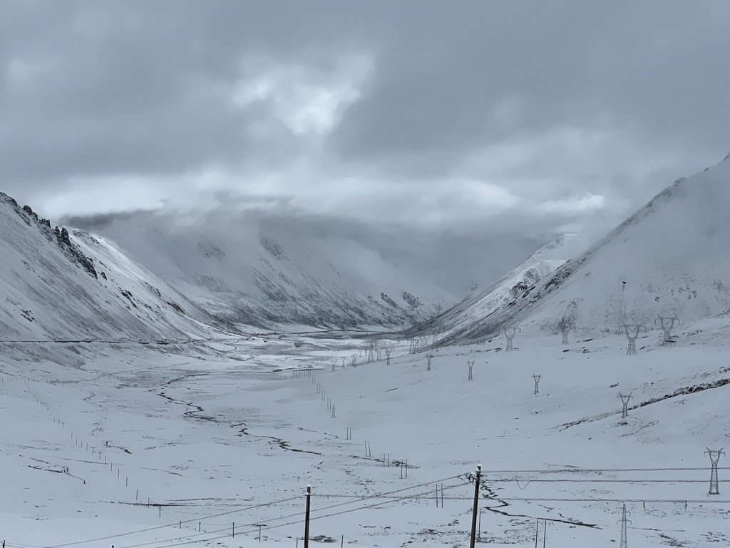 然乌湖到东达山这一段,无论冬夏都可能会有雪,冬季暗冰路段是常事,夏季下雪不多见,如果运气好也会遇到。清晨从然乌湖出发,天色灰蒙蒙的,雨滴落下,行至东达山时,满山大雪……