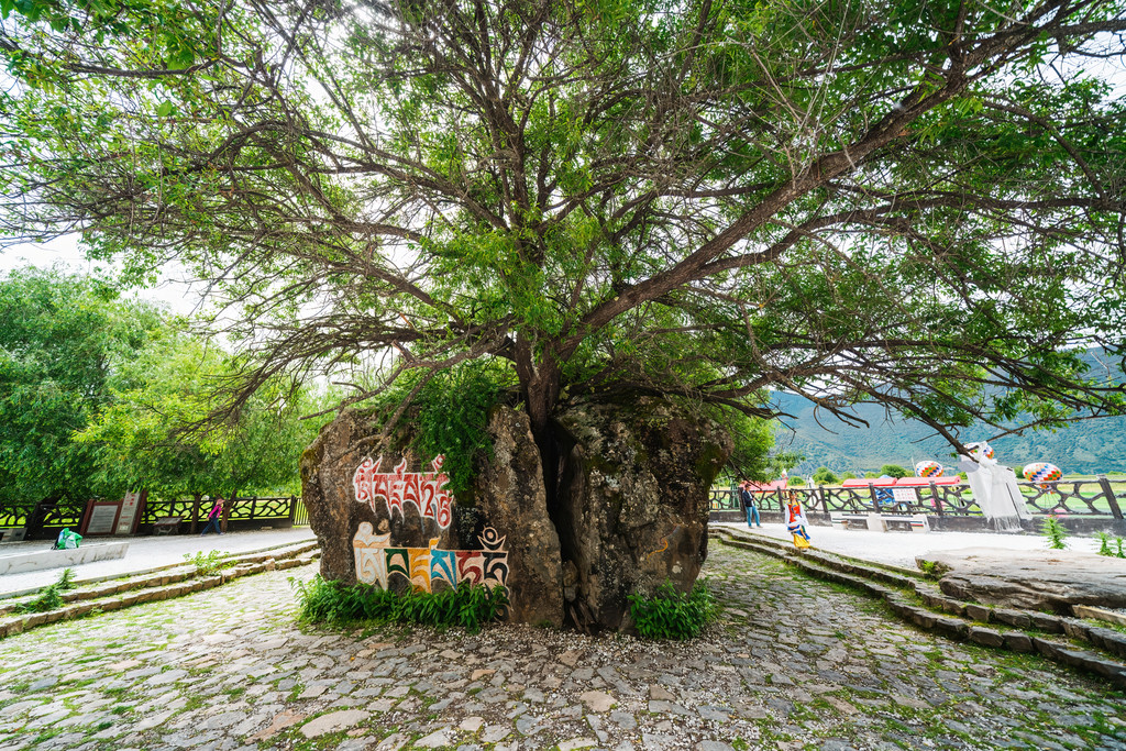 这个神奇的湖泊上有一座中心岛,岛上有几颗神奇的树。第一颗就是古桃抱松,看似相拥一起,却是两棵不同的树种。经时光见证,见岁月传奇。另一棵树是千年青岗树,有1300多年的历史。树叶上会天然形成藏文和生肖,因此又名生肖树。这座小岛上滋生着多样树种,各见神奇,环岛一周,收获满满。