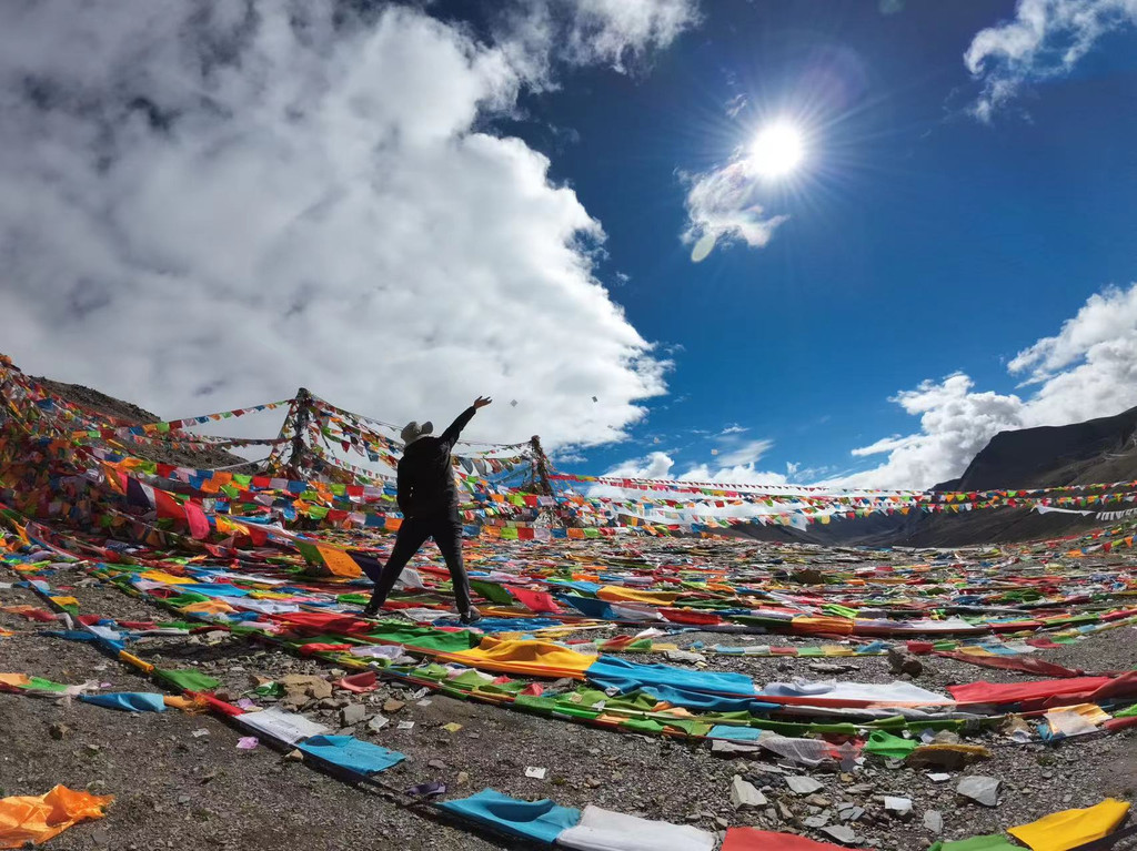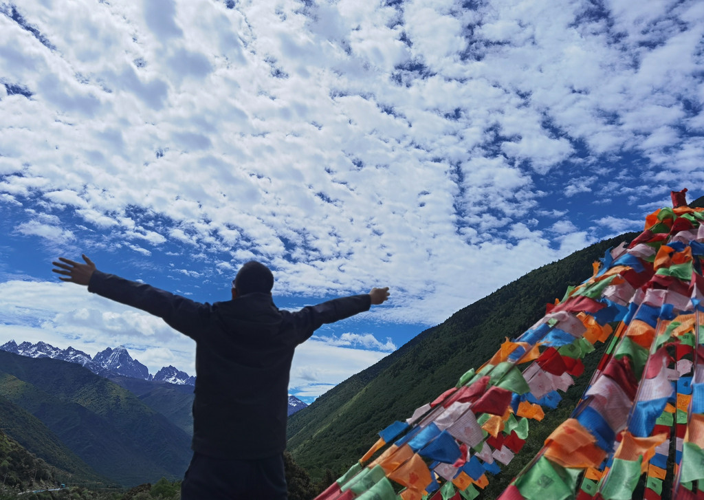 站在经幡下看着蓝天白云,听着风吹过诵读的声音,心情很平静