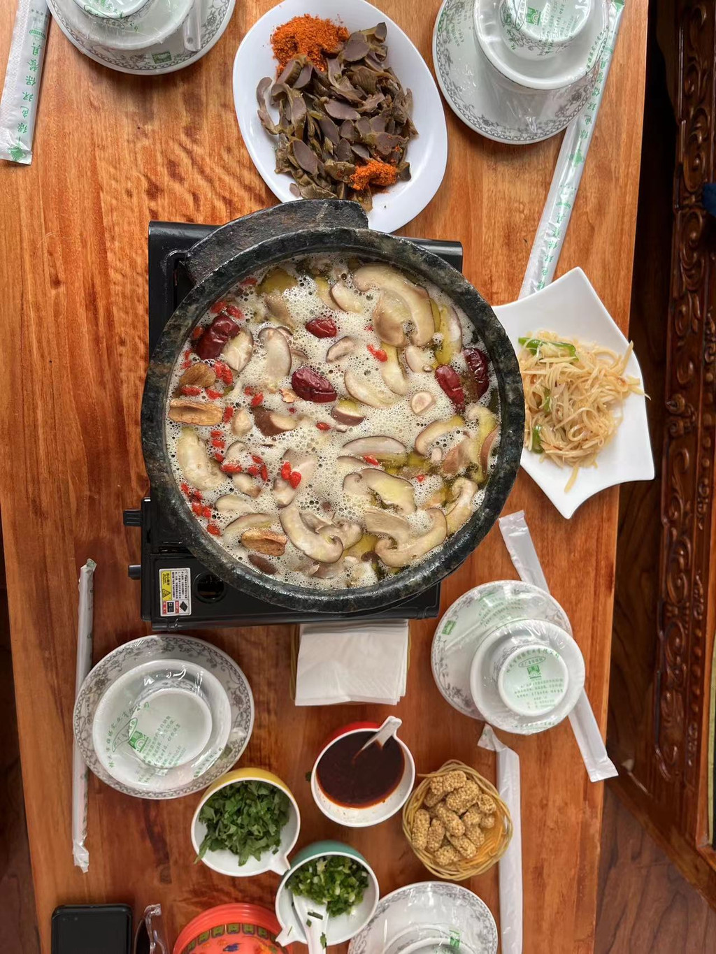 我们点了松茸土鸡煲+碳烤牦牛肉