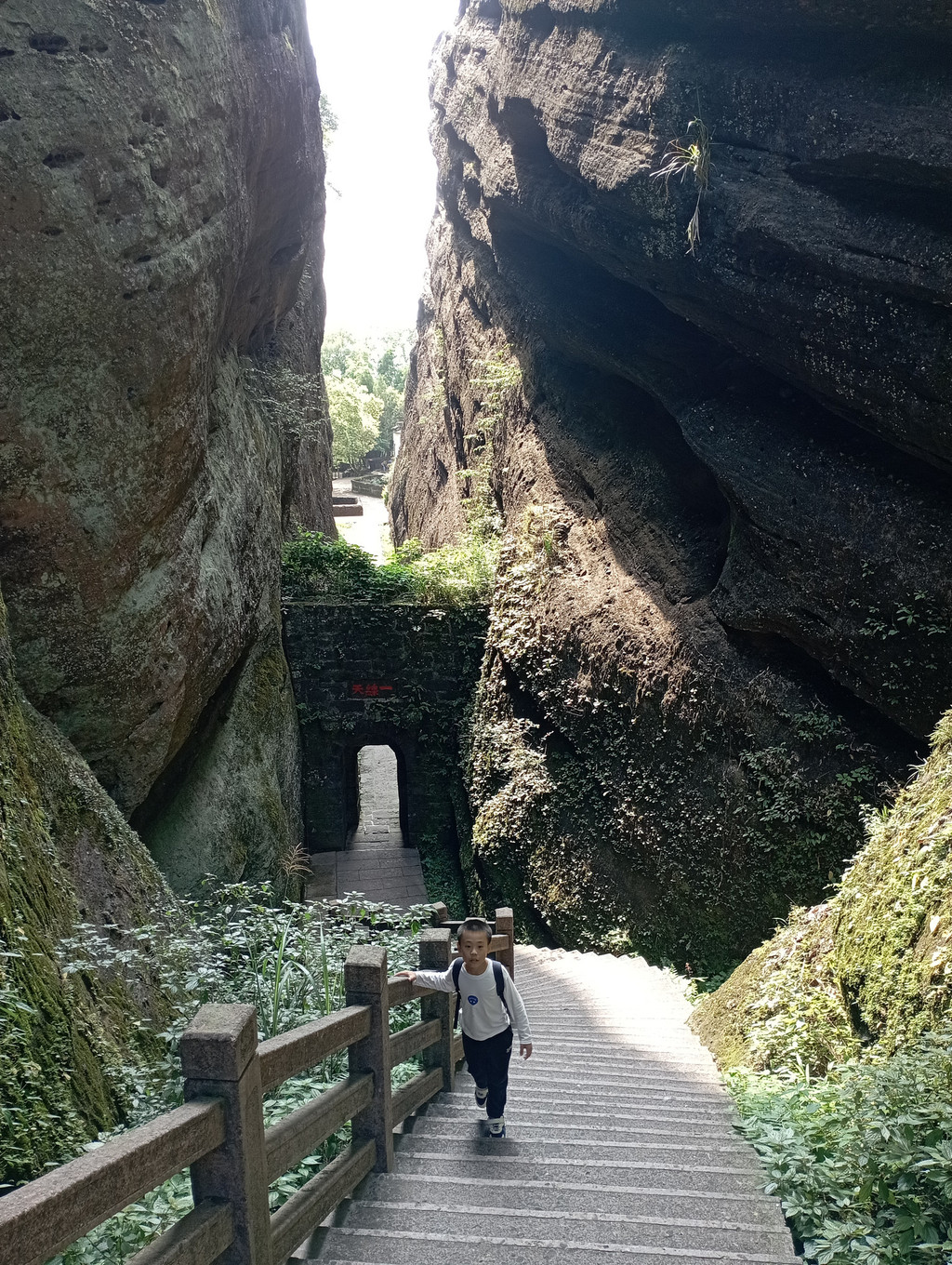 因为不是什么节假日,又是星期五,游客很少。景区有旅游大巴,直接送到了山脚下。山看着委实不算高大雄伟,不过在东南沿海也算是不错了。山路修得比较好,爬起来也不费什么劲,几乎没什么陡峭的地方。就是天气比较闷热了,也没什么风,爬起来还是有些费体力的,要不是山上绿化比较好,遮挡了阳光直射,估计要吃更多苦头。