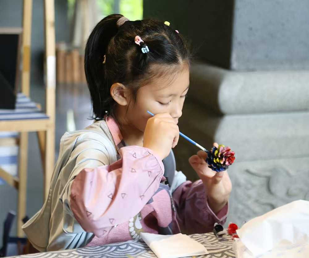 傍晚时分,松果彩绘活动让森林的馈赠变成了童趣的宝藏。孩子们用画笔为松果涂上五彩斑斓的颜色,有的变成了小刺猬,有的化身为童话里的魔法果实。大人们也忍不住加入,用金粉点缀,让松果在夕阳下闪闪发光。