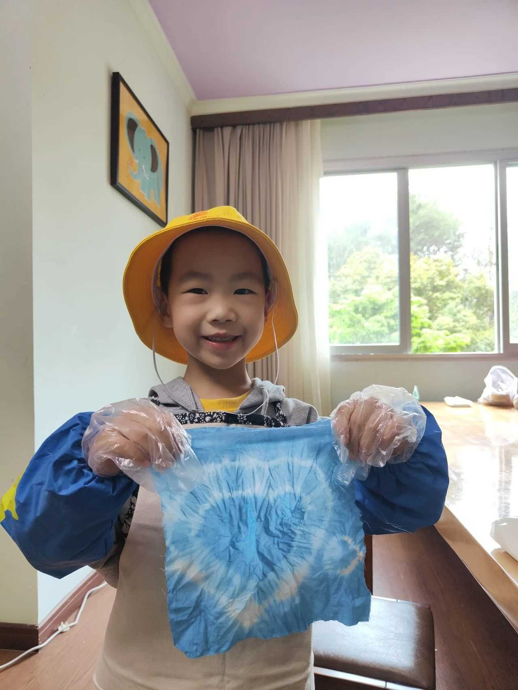 下午的活动从扎染体验开始。在老师的指导下,我们将纯白的布料折叠、捆扎,再浸入靛蓝色的染缸。随着布料展开,每一件作品都呈现出独一无二的纹路,像极了森林中随性的脉络。孩子们兴奋地举着自己的“杰作”,仿佛捧着一片蓝天与白云的缩影。