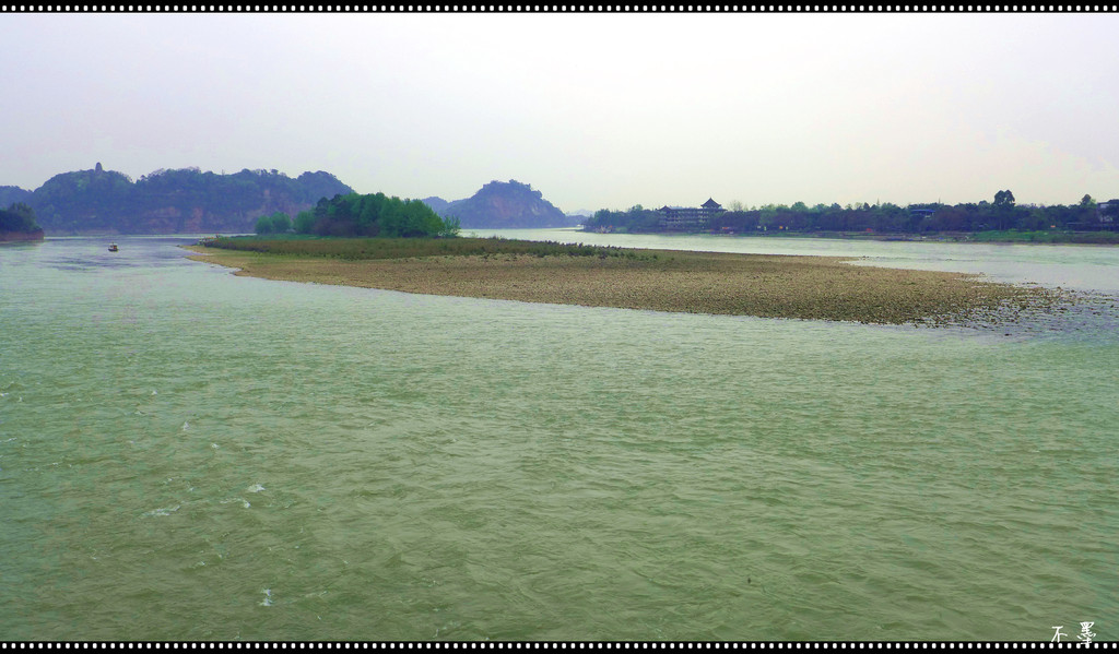 过铁牛门继续沿河行走,远处山形逶迤,灵宝塔、乐山大佛越来越清晰,河面上小船游曳、成群的水鸟嬉戏。