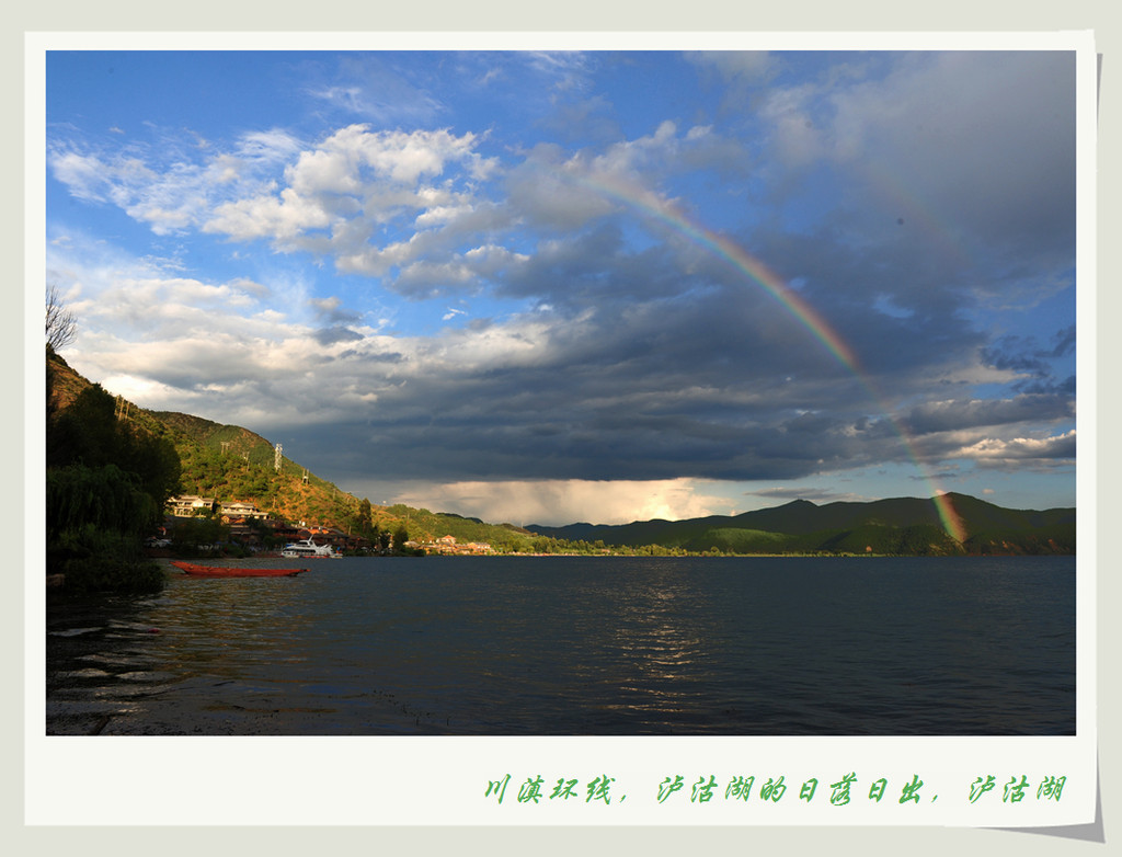 天上的云层不断的变化,蓝天越来多,阳光还时不时的洒到湖面和湖边的村子。慢慢的天空出现下雨的迹象,此时第一反应就是彩虹将要出现。谁知话音落下不到一分钟,泸沽湖上骤然出现一道彩虹,霎时听到一片欢呼声。