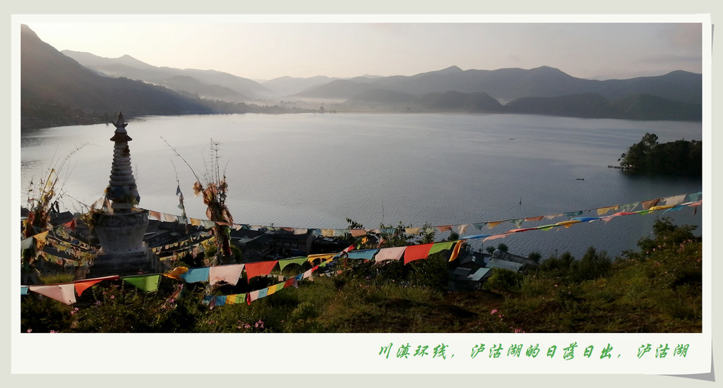 第二天清晨,又是一个晴天,喜欢看日出的旅人不约而同爬山达祖村西面的德庆林寺,这里不仅可以看到达祖村全景,而且可以看到大片的泸沽湖水域,加上特有的寺庙氛围,是个很不错的观赏泸沽湖日出之地。