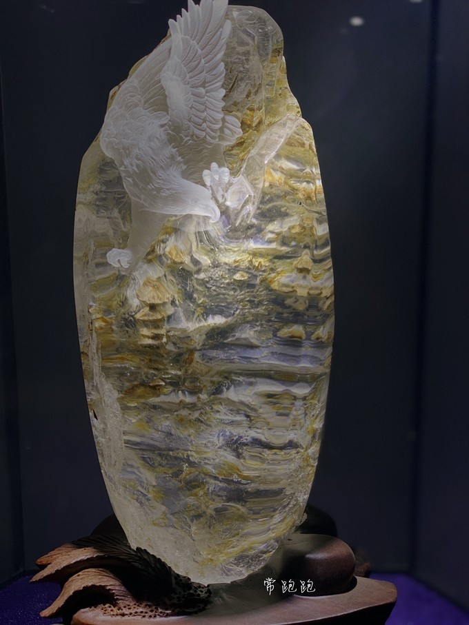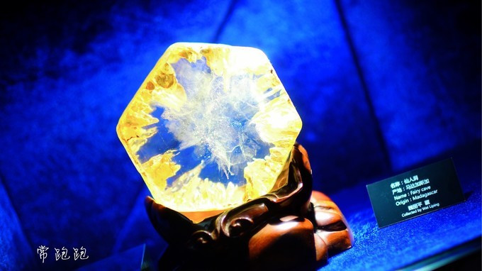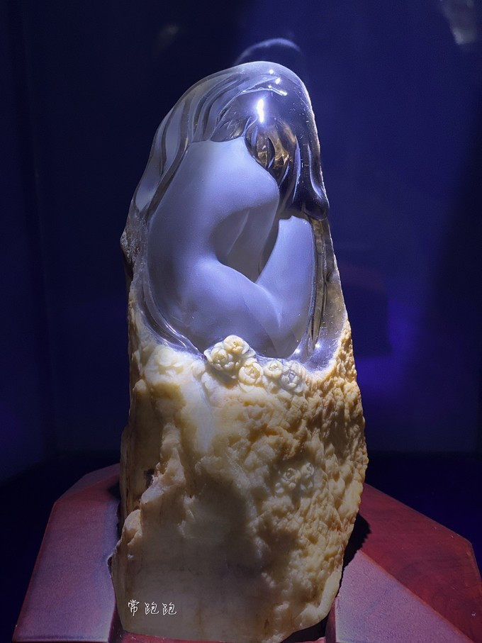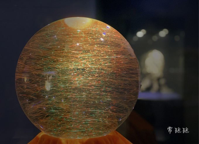 博物馆内,除了晶王镇馆之外,还有另外两个镇馆之宝:金发丝水晶球和佳偶。下图是金发丝水晶球。保价为三亿元,是世界上最大的金发丝纯净体水晶球,水晶球上方灯光颜色会变化,水晶体的发丝也随之变化,美轮美奂。据公布的数据:这颗水晶球直径24公分,是用一块91千克的原石雕刻而成的,目前水晶球重量是19千克。
