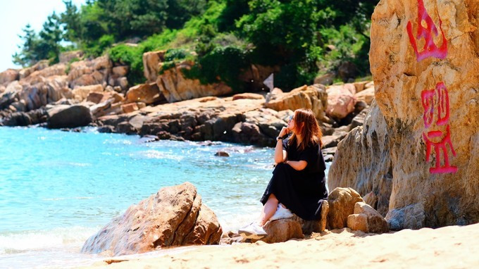 海湾东侧地势比较平缓,沙滩边的礁石上镌刻“海誓”、“山盟”两组4个大字,情侣多来打卡,意在铭记他们“秦晋之约苏马湾,海誓山盟一世缘”的誓言。