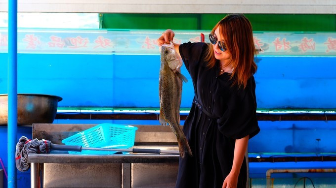 去店里的时候,店老板正在收拾一条海鲈鱼,我拎起来掂掂份量,吼~好家伙,个儿大鳃红,清蒸红烧之绝品。