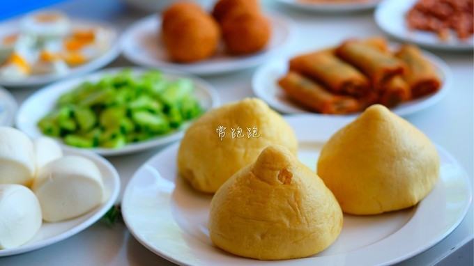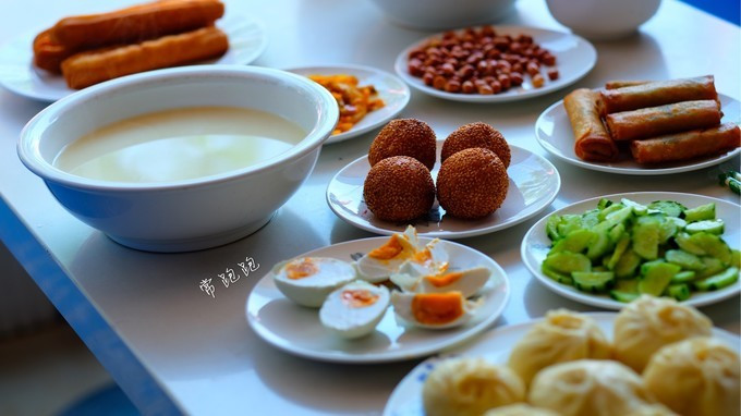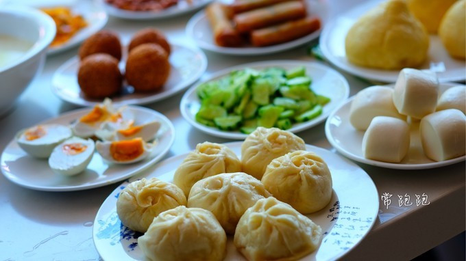 餐厅区域不在住宿区,早餐时间需步行前往就餐,餐品很接地气儿,包子、油条、豆浆、窝窝头、馒头、炸春卷、麻团、咸鸭蛋、各类粥齐全,再配备一些小凉菜,十分丰盛。