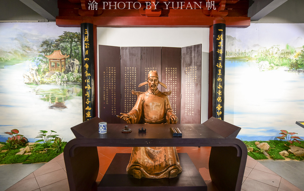燕喜园里面最主要的建筑是刘禹锡纪念馆,大楼飞檐斗拱,采用朱红色的支柱,属于古典式宫廷建筑风格。楼前塑有诗豪刘梦得的青铜雕塑,右手提笔,左手执扇,仿佛正是他在此写下《陋石铭》的模样。“山不在高,有仙则名。水不在深,有龙则灵。斯是陋室,惟吾德馨……”,似乎是说,燕喜山不高,但是这里却出了一位神仙(廖冲),水(燕喜园的前面以前是海阳湖)不在深……