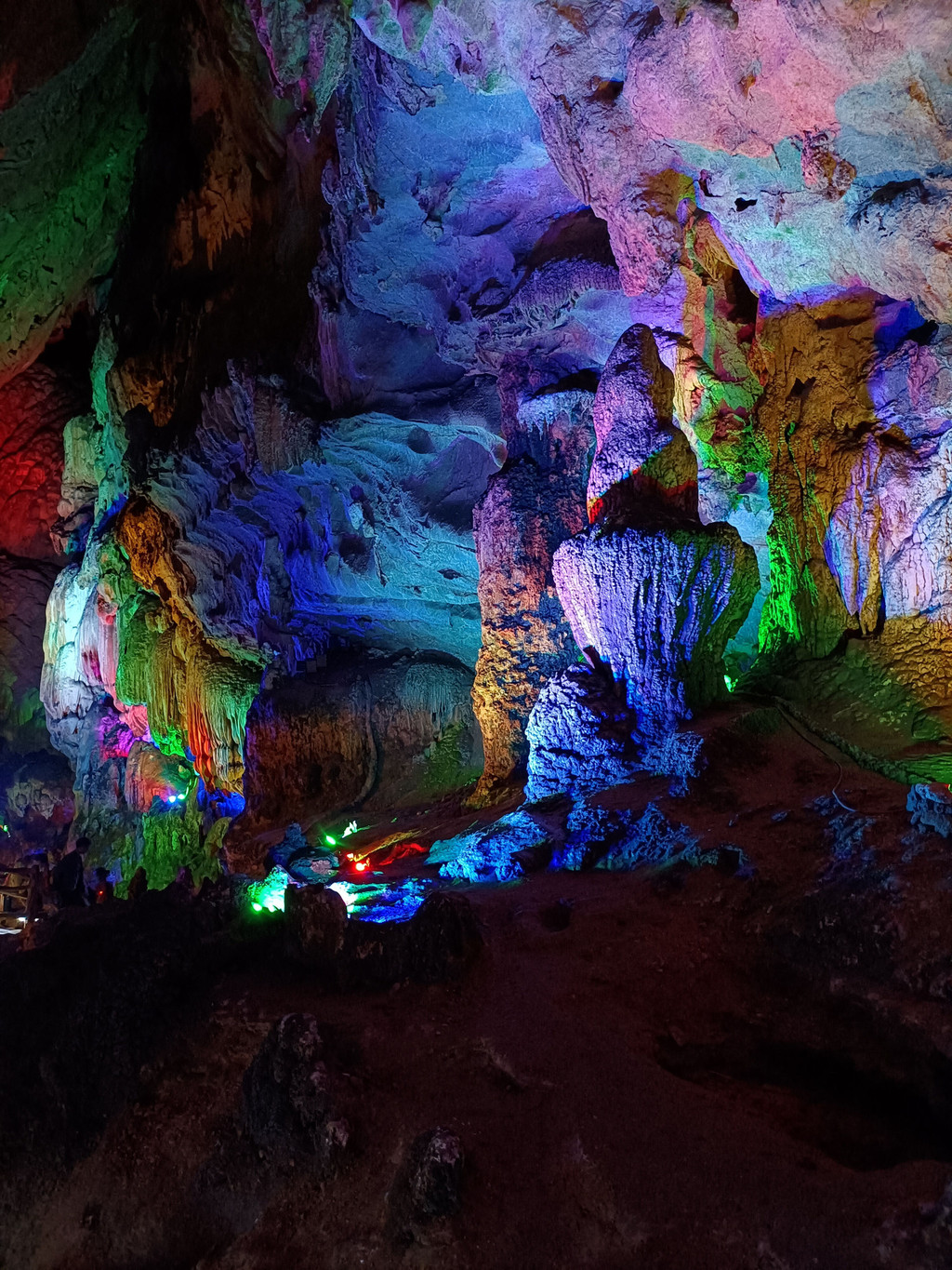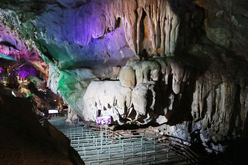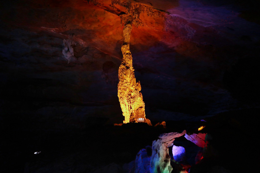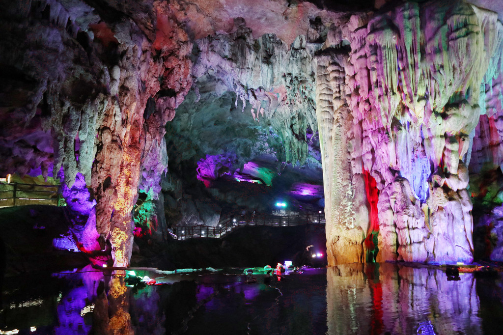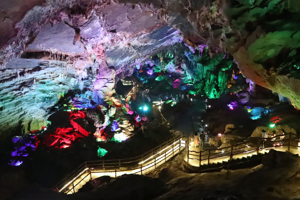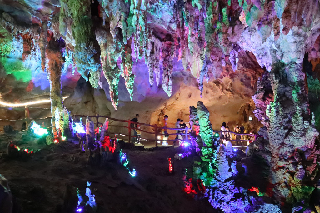 溶洞内有无数千姿百态、瑰丽多彩的钟乳石,游览范围共分三层:上中两层为陆地层,厅堂高大宽阔,岩壁坚固,雄伟壮观,"瀑布""山林"、"幽谷"、"田园"、"瑶寨",百花争艳,鸟飞云走……;下层是一条地下暗河,由北向南蜿蜒1500米,经过三个美丽的峡谷,穿过四座山头底部,两岸奇景密布,巧夺天工,美不胜收。
