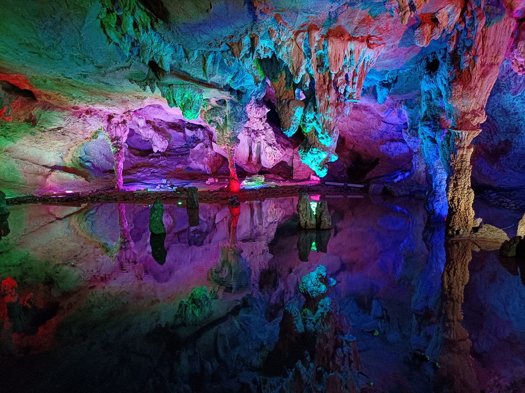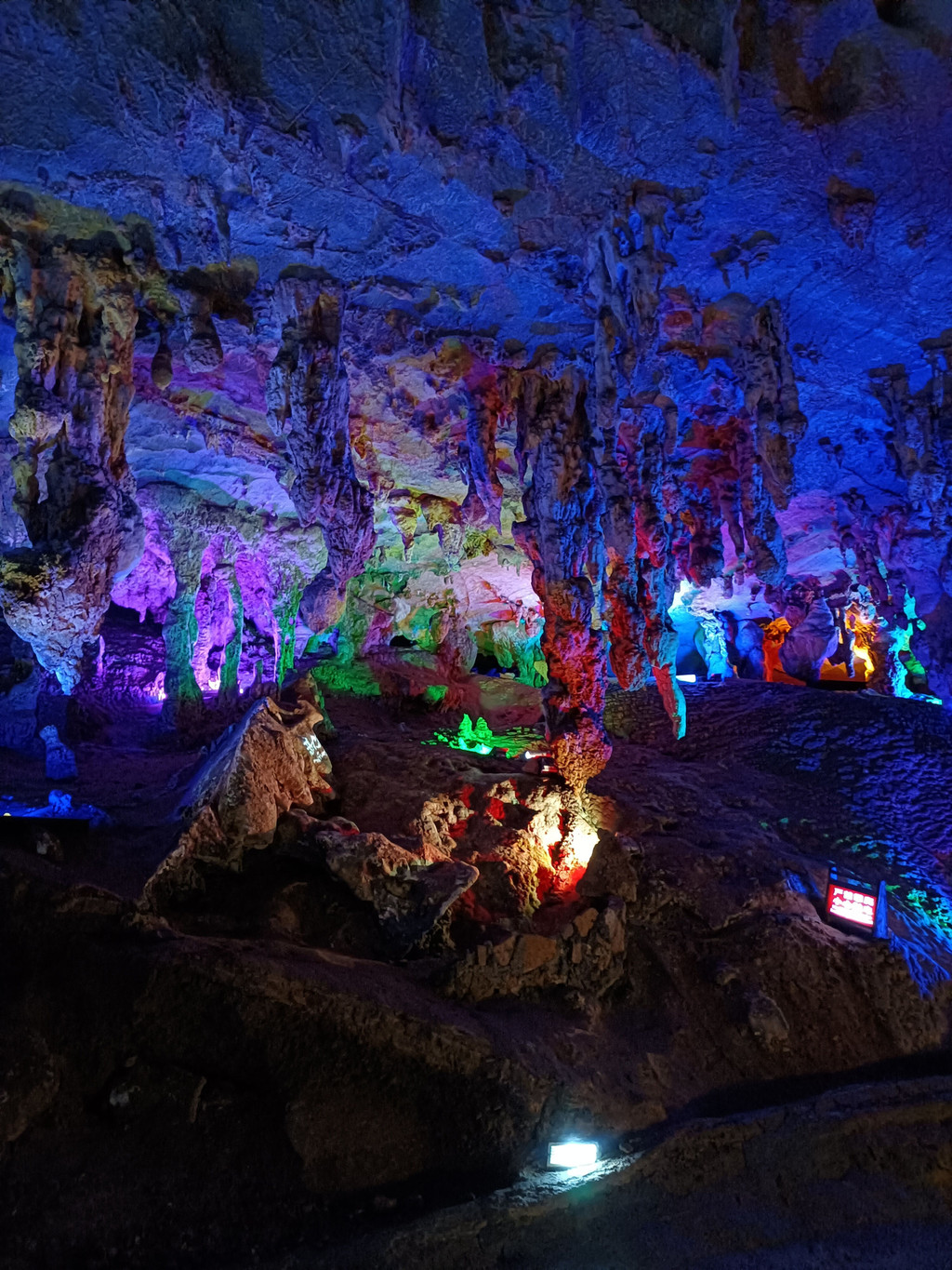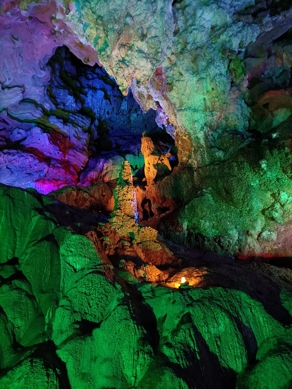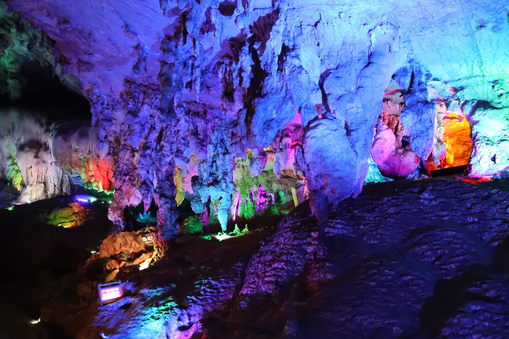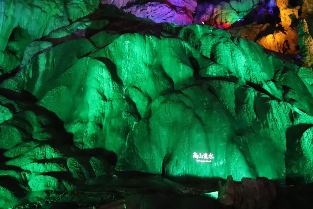 溶洞内有无数千姿百态、瑰丽多彩的钟乳石,游览范围共分三层:上中两层为陆地层,厅堂高大宽阔,岩壁坚固,雄伟壮观,"瀑布""山林"、"幽谷"、"田园"、"瑶寨",百花争艳,鸟飞云走……;下层是一条地下暗河,由北向南蜿蜒1500米,经过三个美丽的峡谷,穿过四座山头底部,两岸奇景密布,巧夺天工,美不胜收。