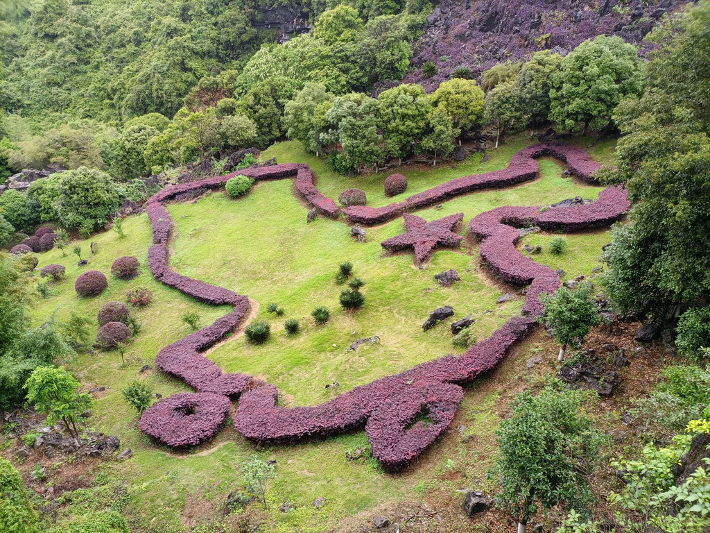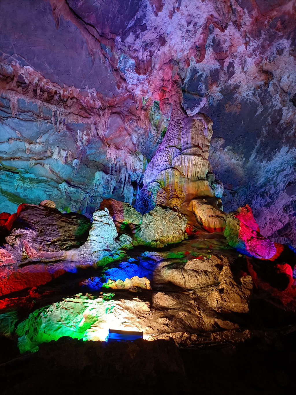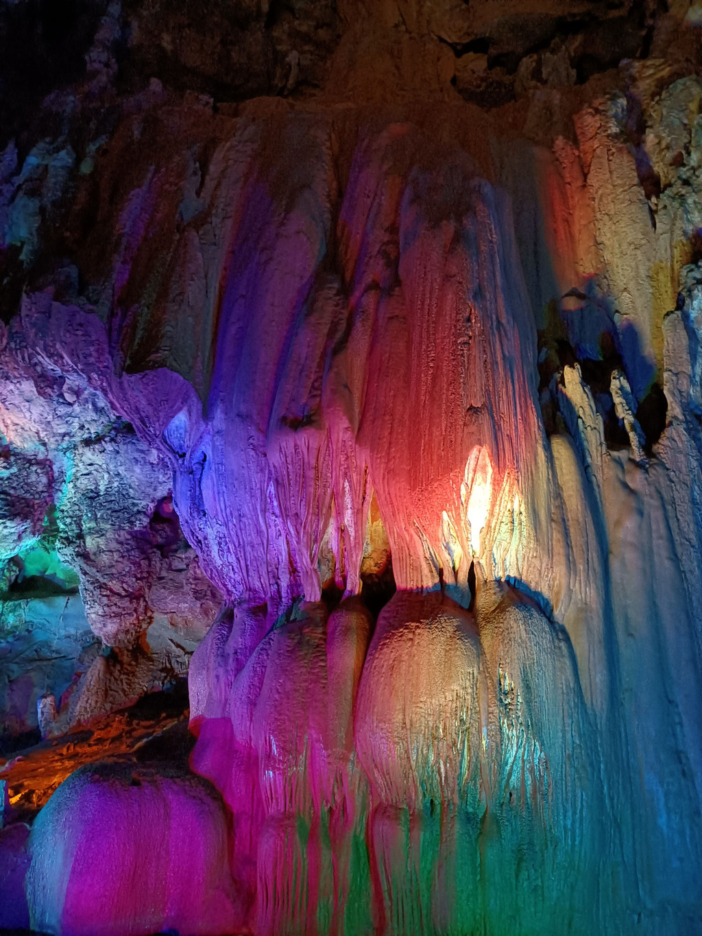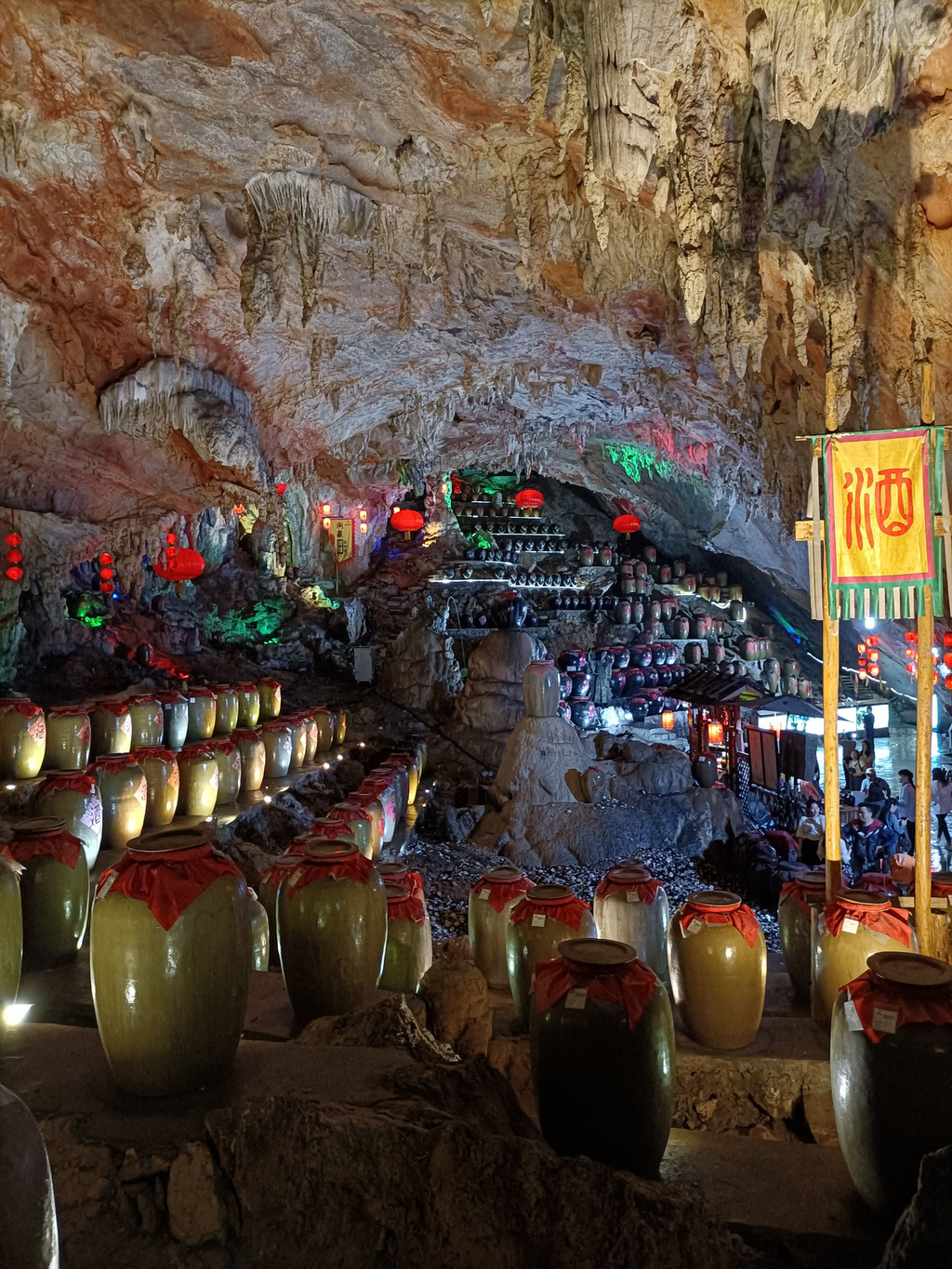 溶洞内有无数千姿百态、瑰丽多彩的钟乳石,游览范围共分三层:上中两层为陆地层,厅堂高大宽阔,岩壁坚固,雄伟壮观,"瀑布""山林"、"幽谷"、"田园"、"瑶寨",百花争艳,鸟飞云走……;下层是一条地下暗河,由北向南蜿蜒1500米,经过三个美丽的峡谷,穿过四座山头底部,两岸奇景密布,巧夺天工,美不胜收。