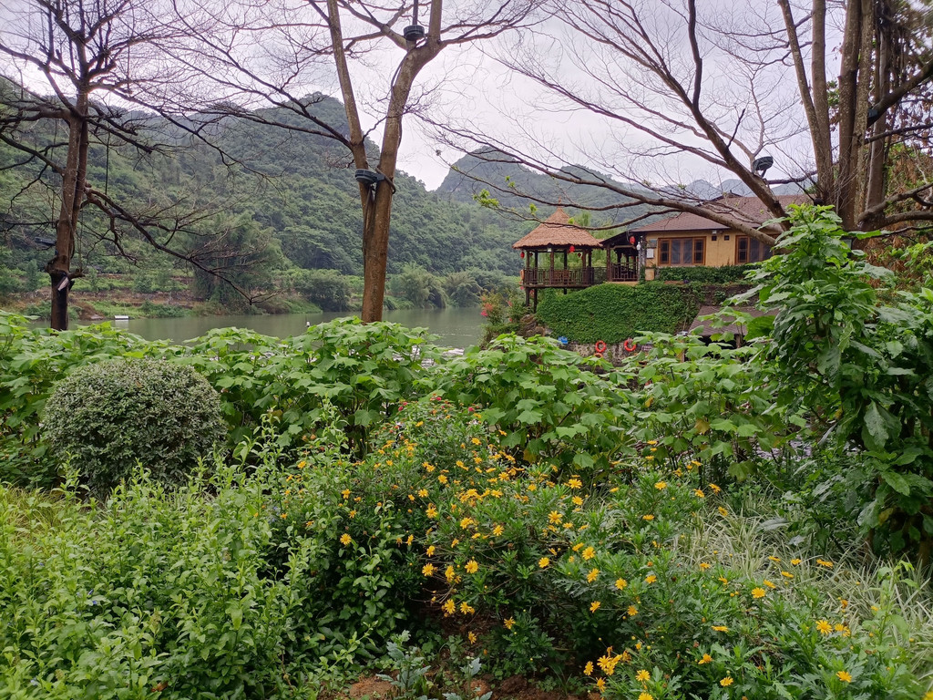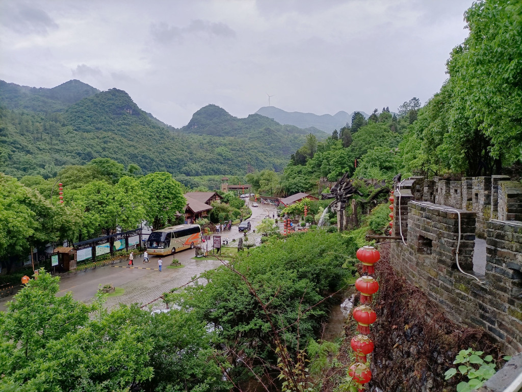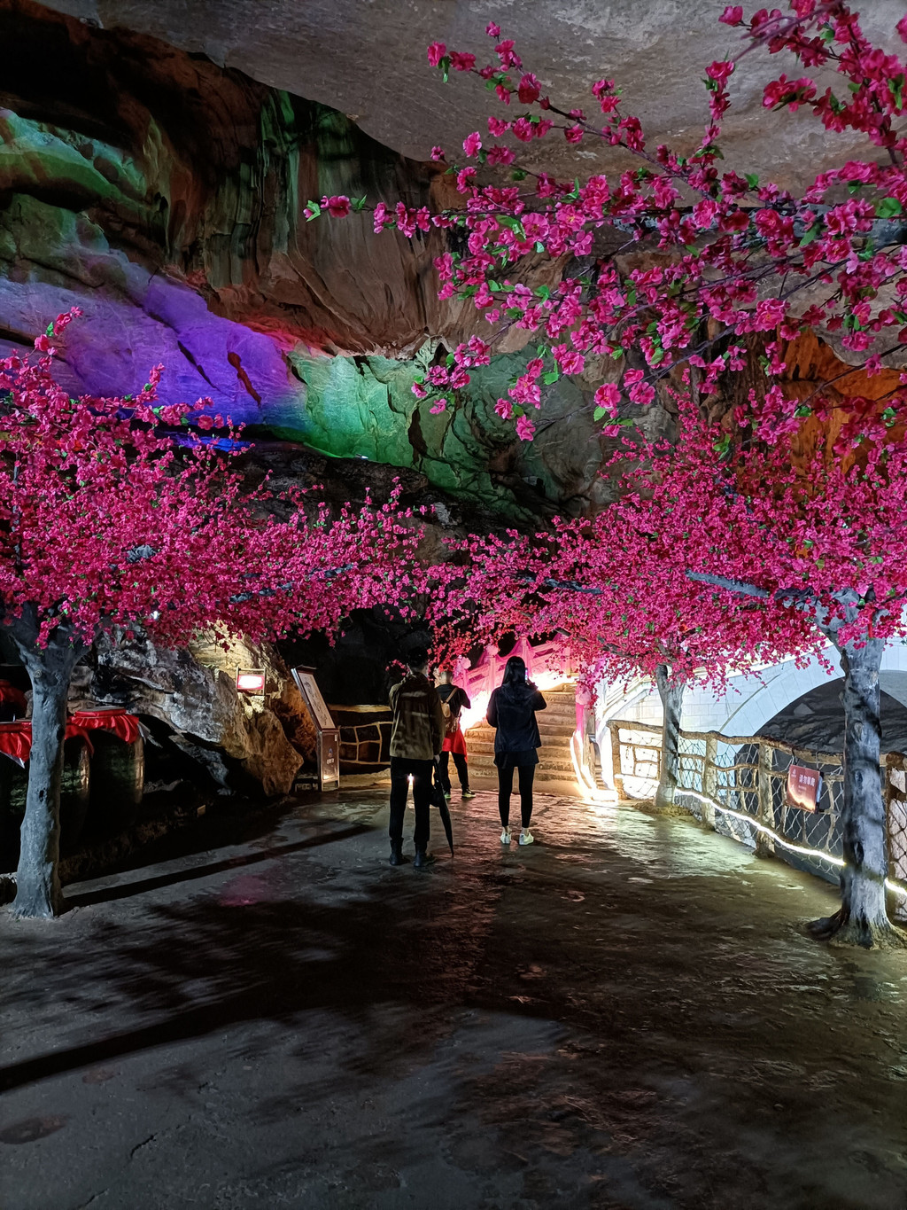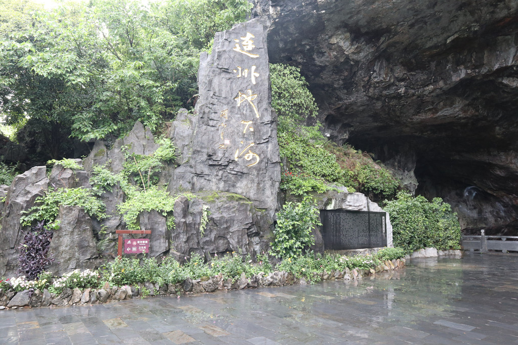 第三天早上,天下着雨,雨已经下了一晚上了。早餐后,等雨停了,我们就出门了,今天要去连州地下河了。在连州汽车站外的公交站有一趟去东陂镇的公交车,会经过地下河景区路口的,车费5元,车程大约30分钟。从路口到景区门口还有约2.5公里距离,下了公交车,就看到路旁有一辆电动三轮车在拉客(好奇为什么只有一个拉客的,是因为太少自己坐车来的游客吗?),每人10元钱可以送到景区门口(记得找司机拿联系电话,回程时可以找他接送到车站)。在景区门口再走几分钟才到景区售票处,门口的工作人员说,由于大雨,河水上涨超过警戒线,游船暂停开放了。噢!晴天霹雳啊,地下河的最大亮点就是乘船游览啊,没得坐船那还有啥意义。然后工作人员说票价下调了,只要80元就行了,便宜了十几块钱。来都来了,就此离开有点不甘心啊,还是进去吧。把网上订的门票退了,然后重新在现场买了门票。