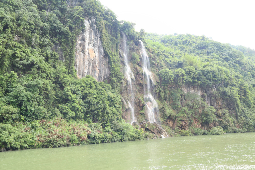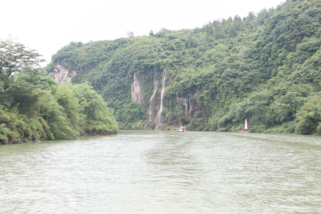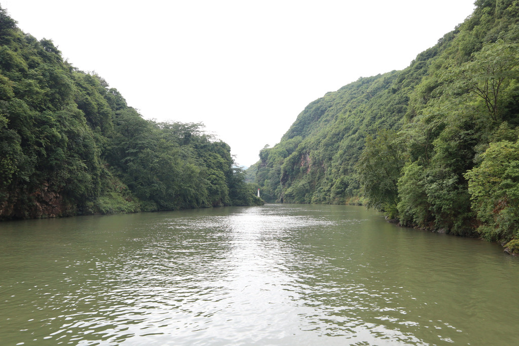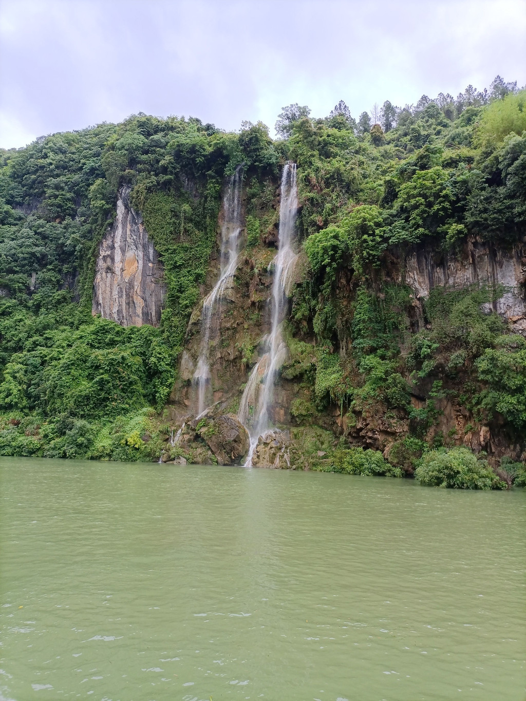 趁着雨停了,我们就先去坐船游三峡。游船是有几种类型的,有一种是可以上二楼甲板的,建议选坐这类游船,二层的甲板空间够大,可以随意拍照,不用担心人多。湟川三峡是指羊跳峡、楞枷峡和仙女峡。峡谷周遭群峰连绵,满目苍翠,悬崖峭壁大开大合,不时有瀑布飞泻而下,可谓美不胜收。由于导游是在一层船舱讲解,我在二层甲板拍照,所以也没听讲解 ,也没分清三峡的位置在哪里,只是一路随意地吹着风,拍着照。游船的时间不是很长,20分钟左右就到达终点了,然后就掉头往回走了,回程的速度更快点,全程30分钟左右就完了,感觉有点意犹未尽。