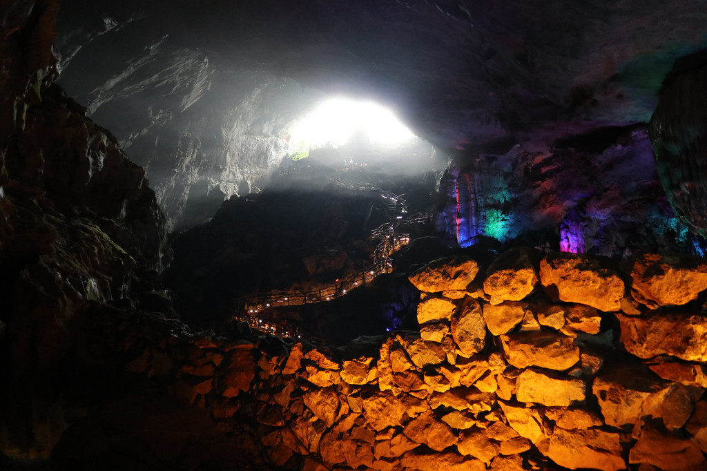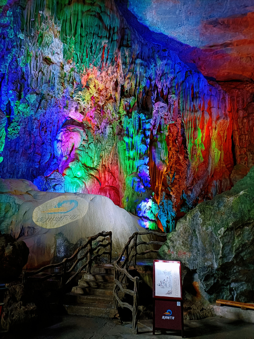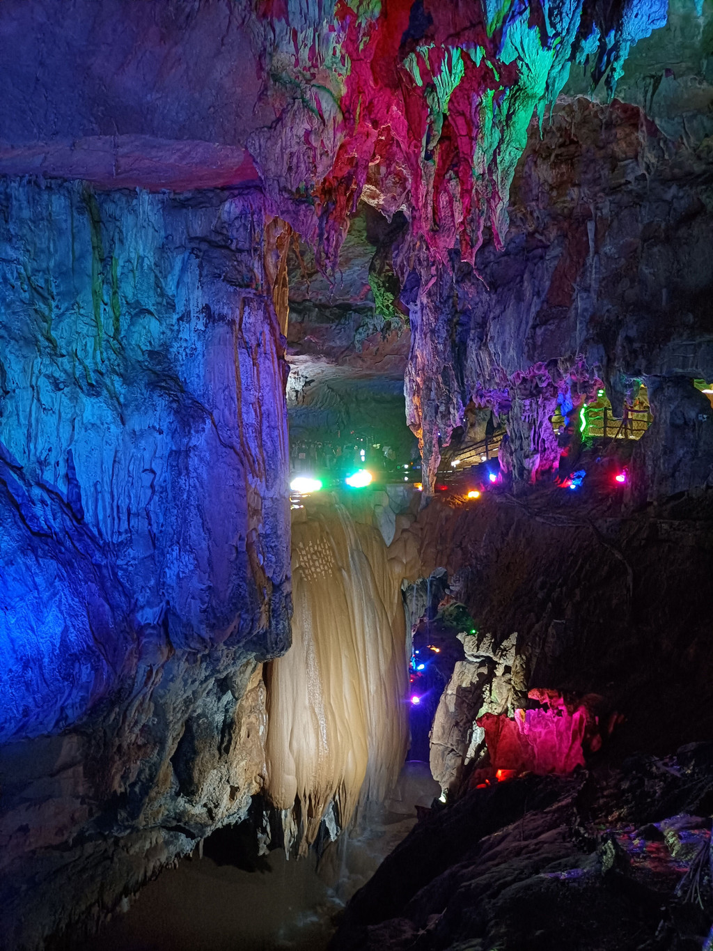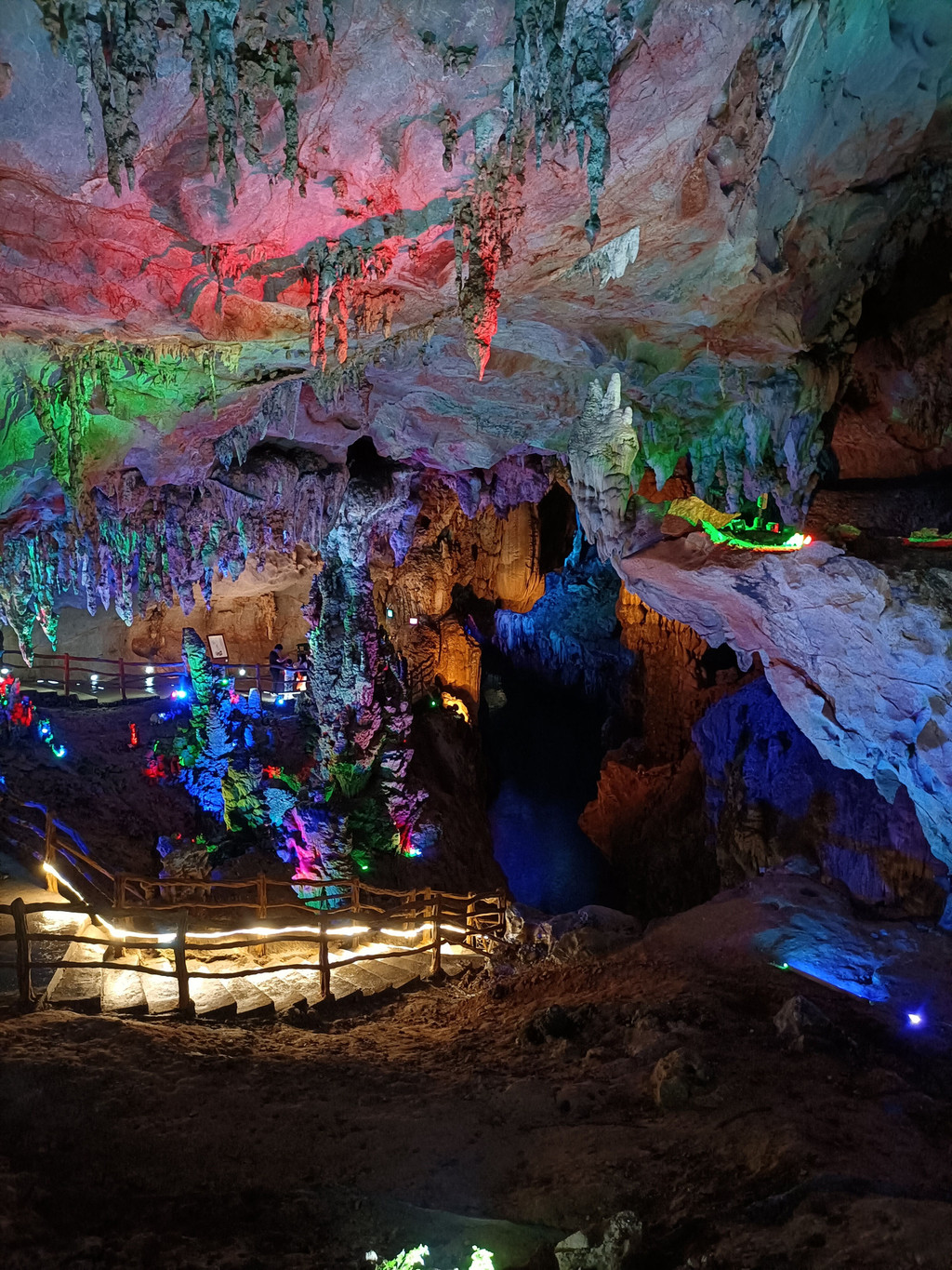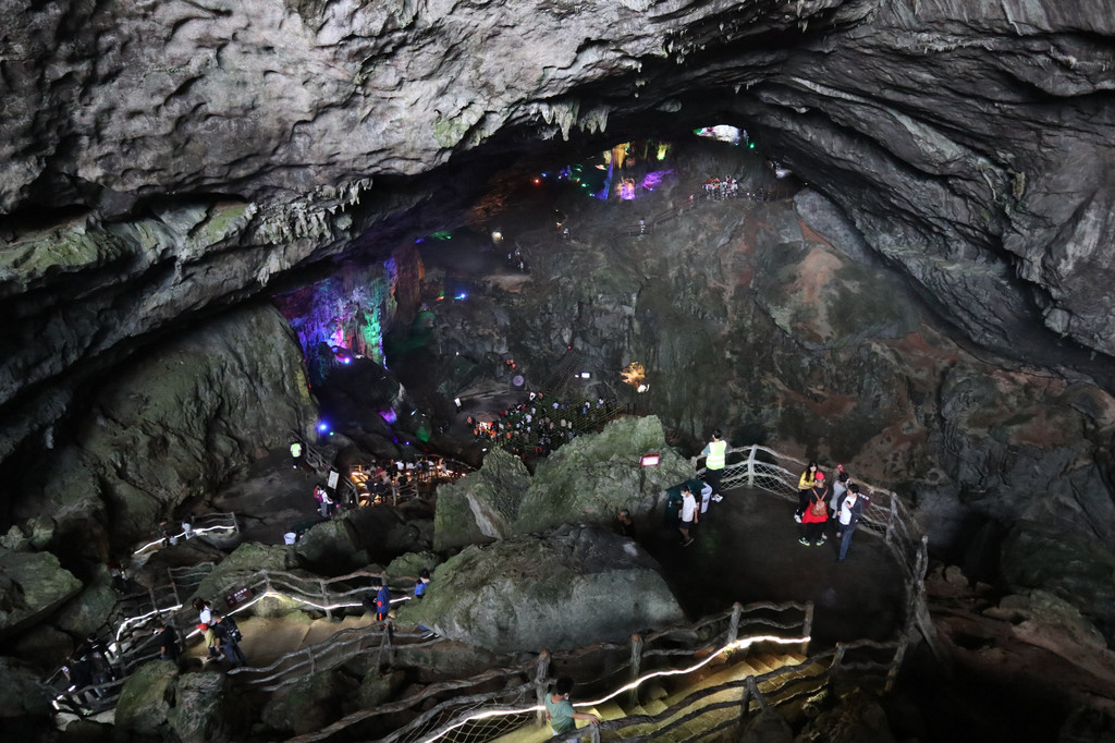在游客中心把行李寄存后,我们来到地下河的入口。从入口往下看,里面是一个很大的溶洞,已经有游客在排队等候进洞了。景区的管理很不错,控制着游客有序进洞,十来个人一队,每队安排一个导游带领。
