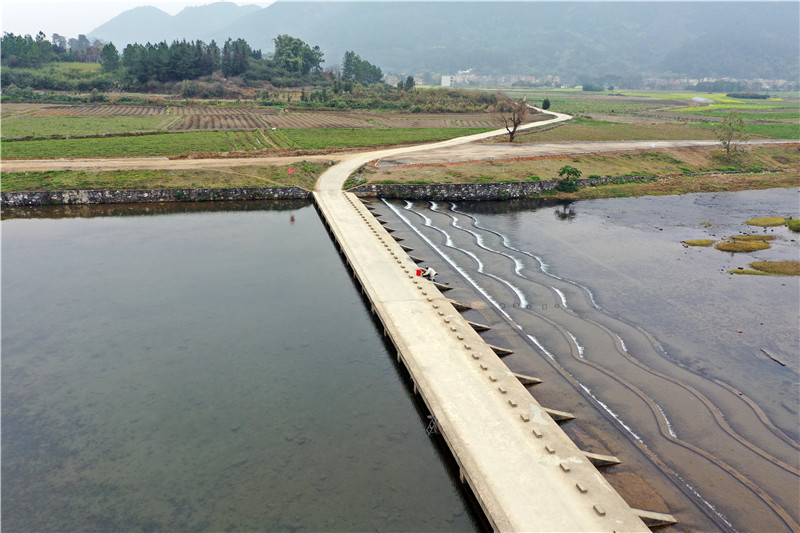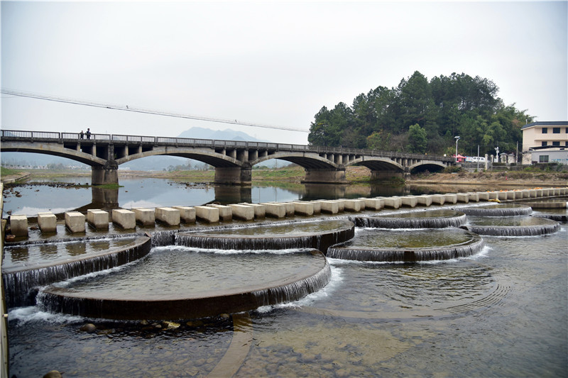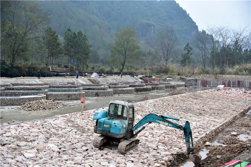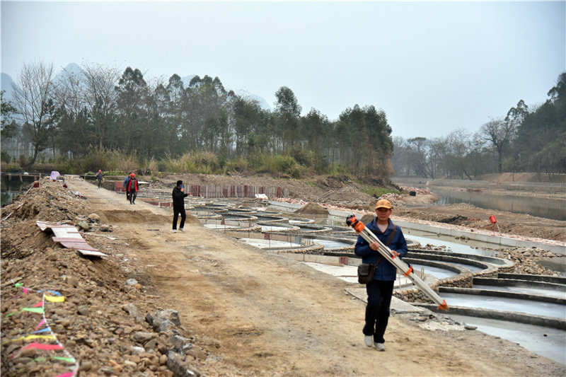 河道正在施工,多台勾机在清理河道,施工人员在建设鱼鳞叠坝设施,河堤建有廊道绿道,方便游客沿河徒步或骑行。鱼鳞坝既是景观,也是村民的生活设施,路过桥梁。整个河道建设工程正在如火如荼,工程完工后,与沙坊古村、美丽田园一起,串成连州乡村旅游与全域旅游的新板块。